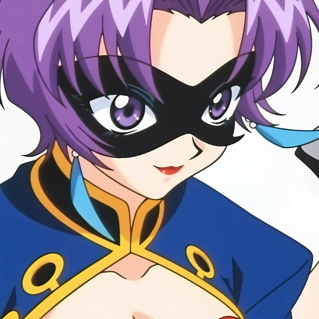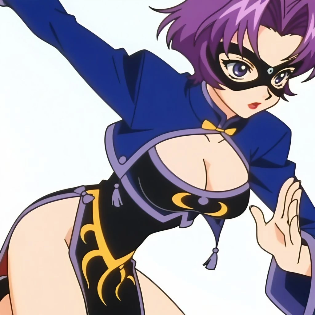 Death Crow: sdxl-akiba-death-crow, purple hair, short hair, purple eyes, large breasts, makeup, red lipstick, eyelashes, parted bangs, cleavage, clothing cutout, long sleeves, blue jacket, cropped jacket, leotard, chinese clothes, black high heels, china dress, eye mask