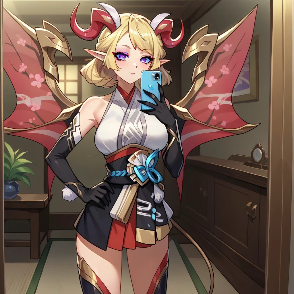 verakmn, purple eyes, eyeshadow, blonde hair, short hair, demon horns, pointy ears, bare shoulders, wings, tail, japanese clothes, kimono, obi, detached sleeves, black gloves, elbow gloves, black thighhighs, sandals