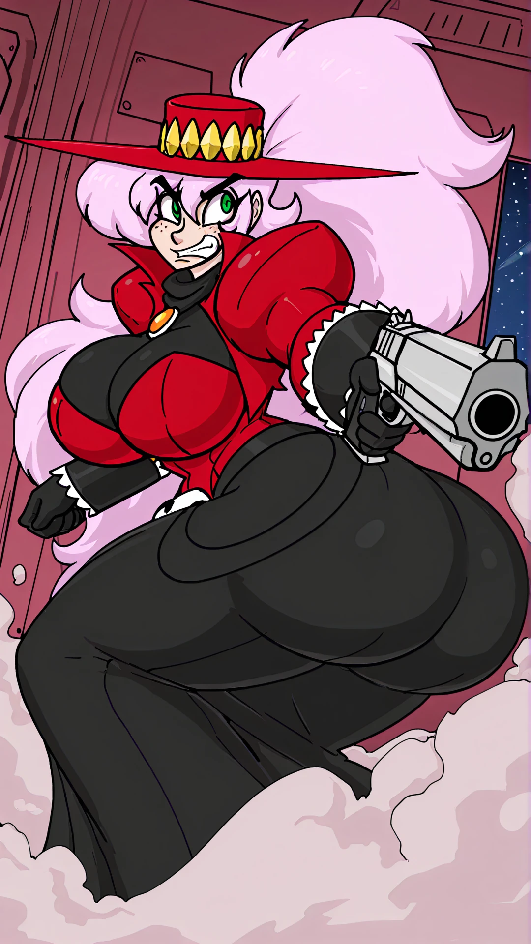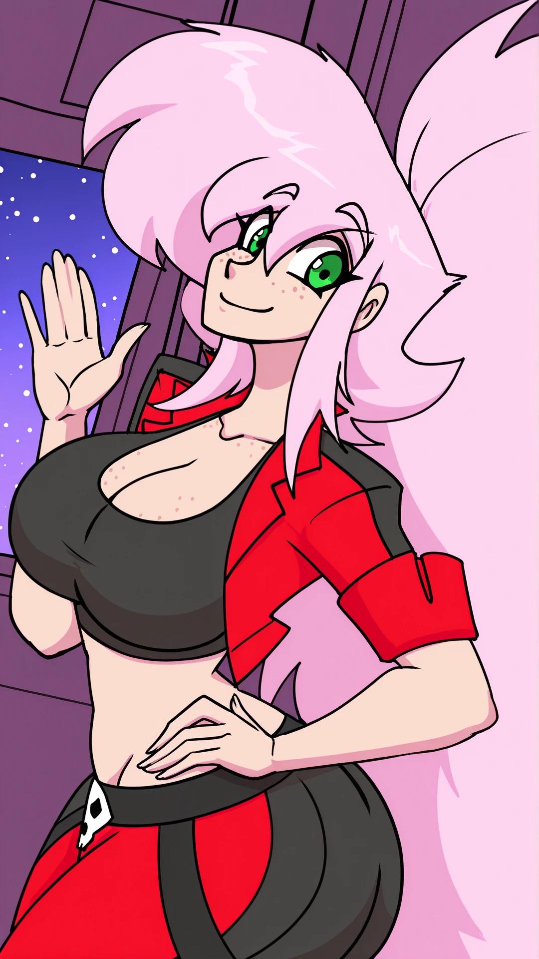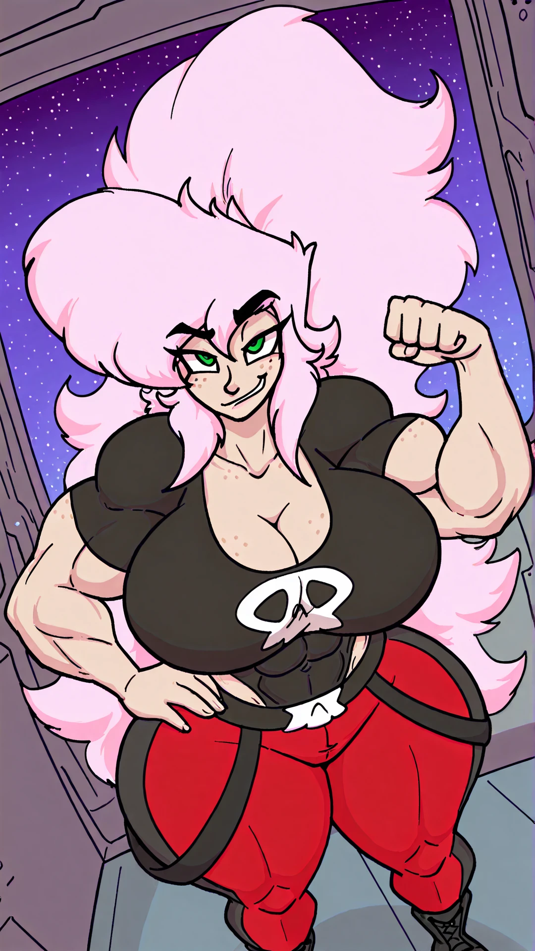 pink hair, big hair, long hair, freckles, green eyes, large breasts, wide hips, bubble butt, athletic build,