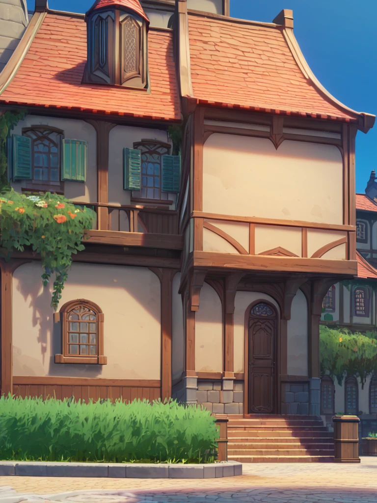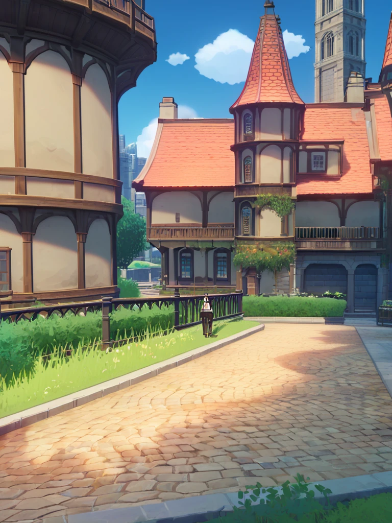 , city, mondstadt, scenery, outdoors, cityscape, sky, cloud, architecture, building, house, road, plant, grass, bush, railing, lamppost, door, stairs,