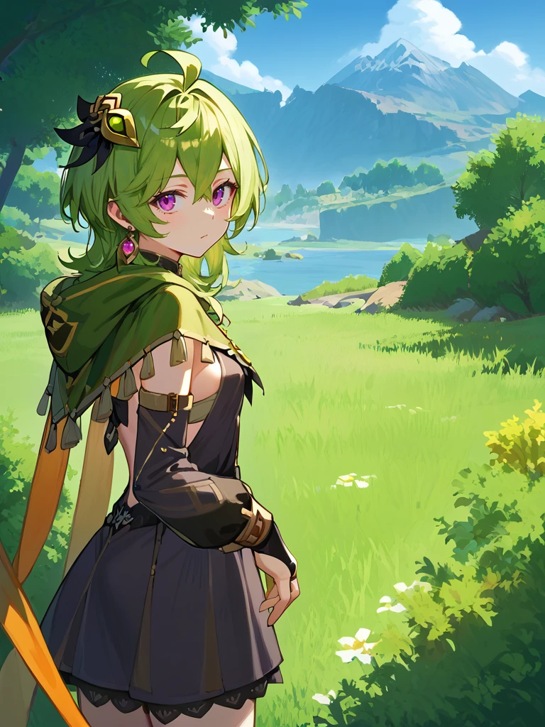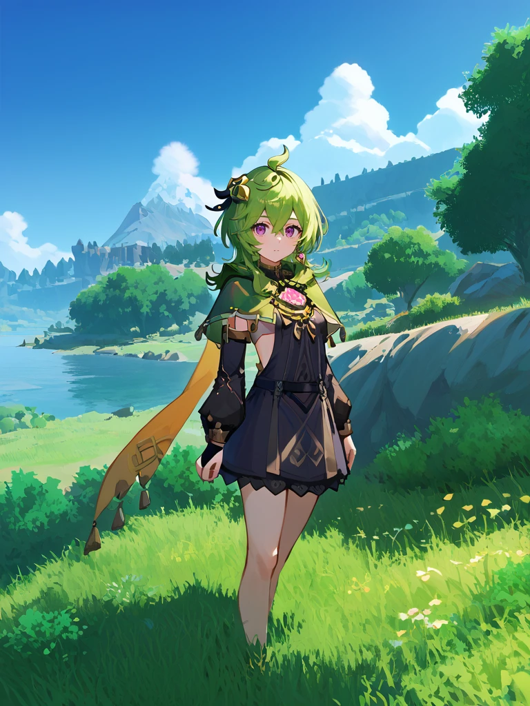 , field, mondstadt, scenery, outdoors, landscape, sky, cloud, nature, tree, grass, rock, bush, water, river, mountain,