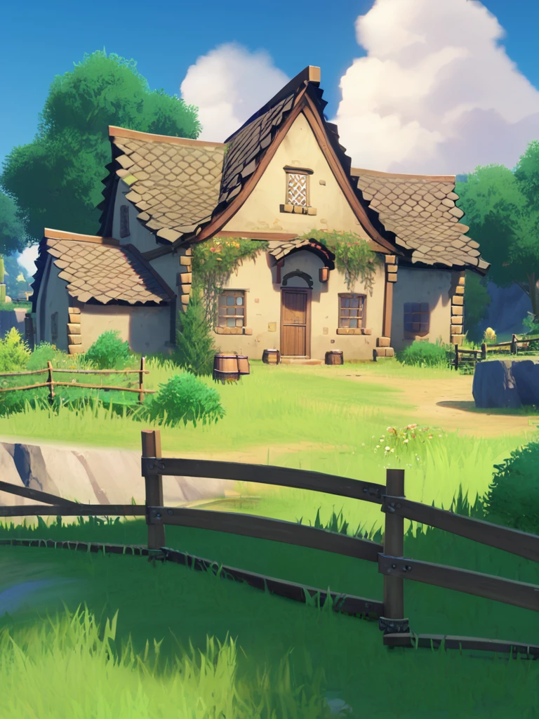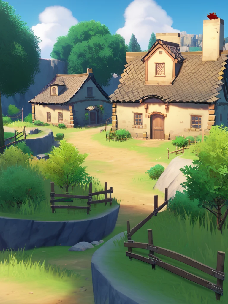 , village, mondstadt, scenery, outdoors, landscape, sky, cloud, nature, architecture, building, house, chimney, grass, tree, fence, bush, plant, rock, path, flower,
