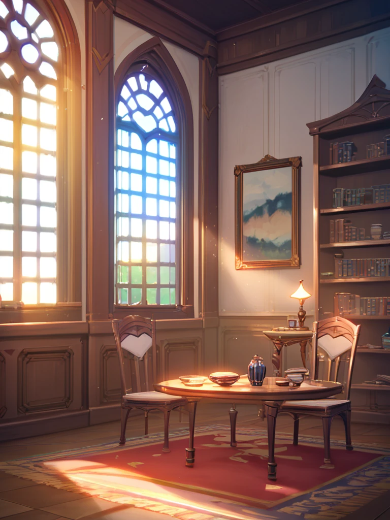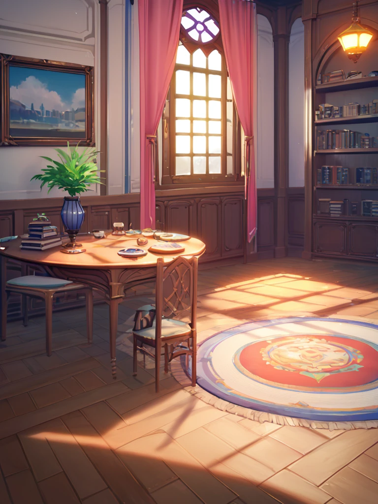 , indoors, mondstadt, scenery, architecture, chair, window, table, wooden floor, lamp, plant, light, shelf, carpet, sunlight, painting /(object/),