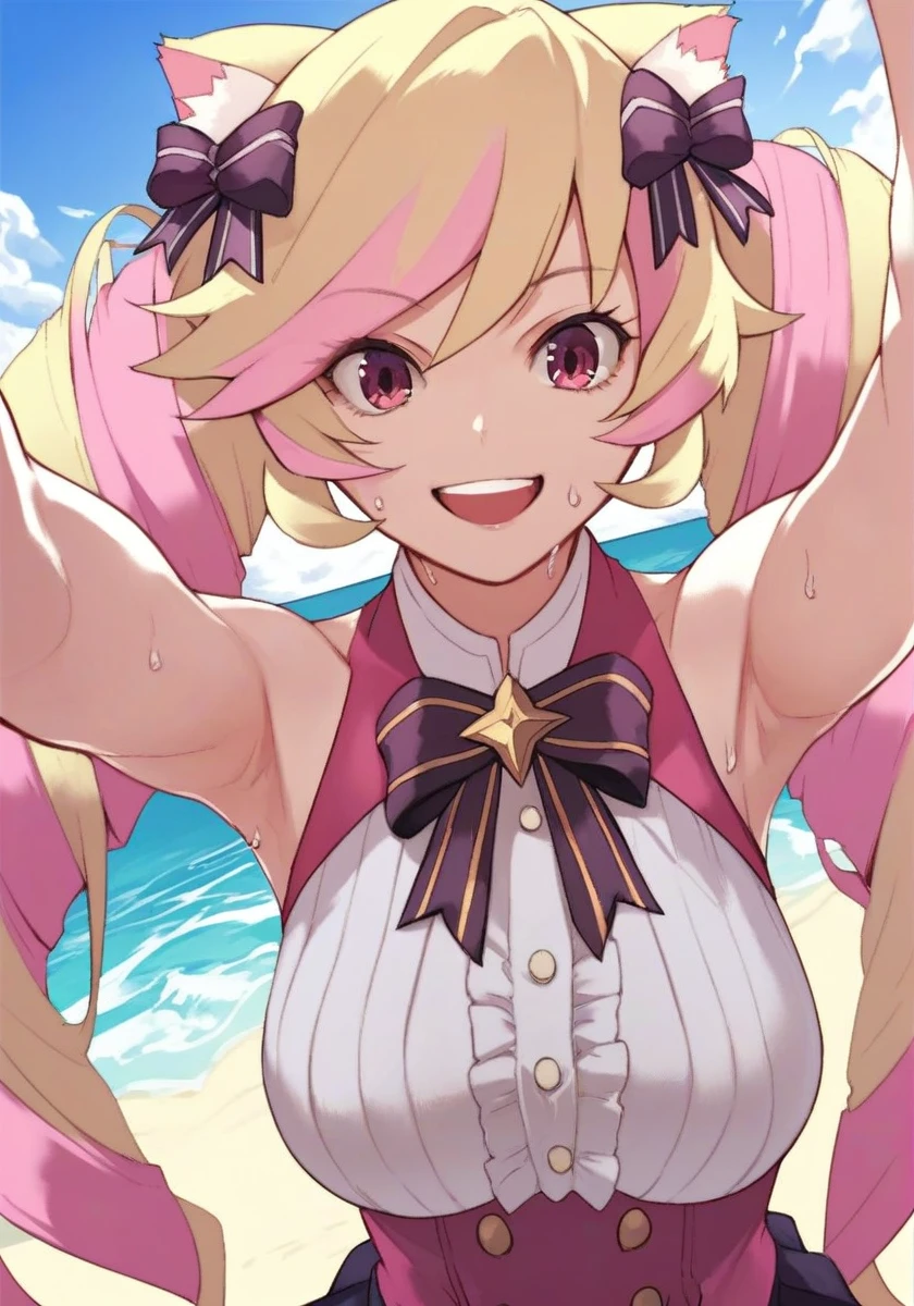 mashima_himeko, 1girl, solo, multicolored tail, animal ears, blonde hair, cat ears, multicolored hair, cat tail, long hair, skirt, pink hair, twintails, drill hair, very long hair, jacket, long sleeves, pink jacket, pink eyes, thighhighs,