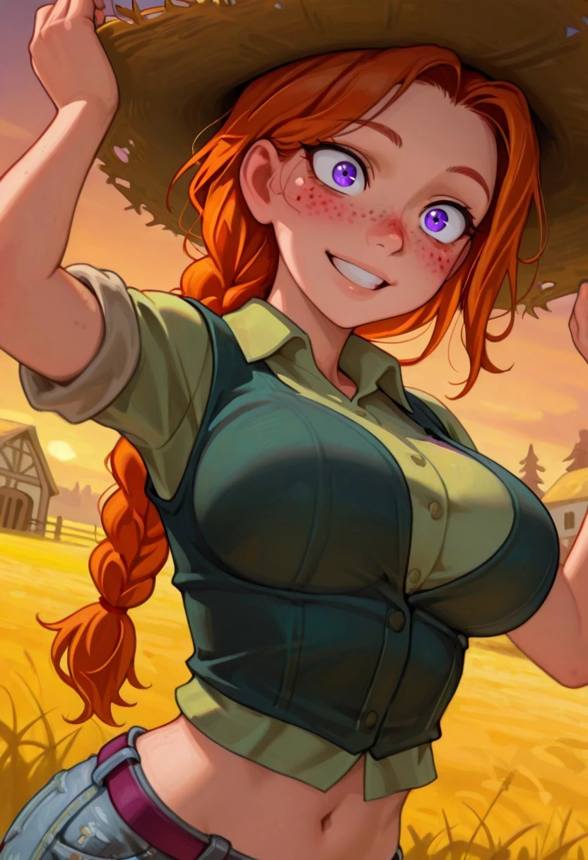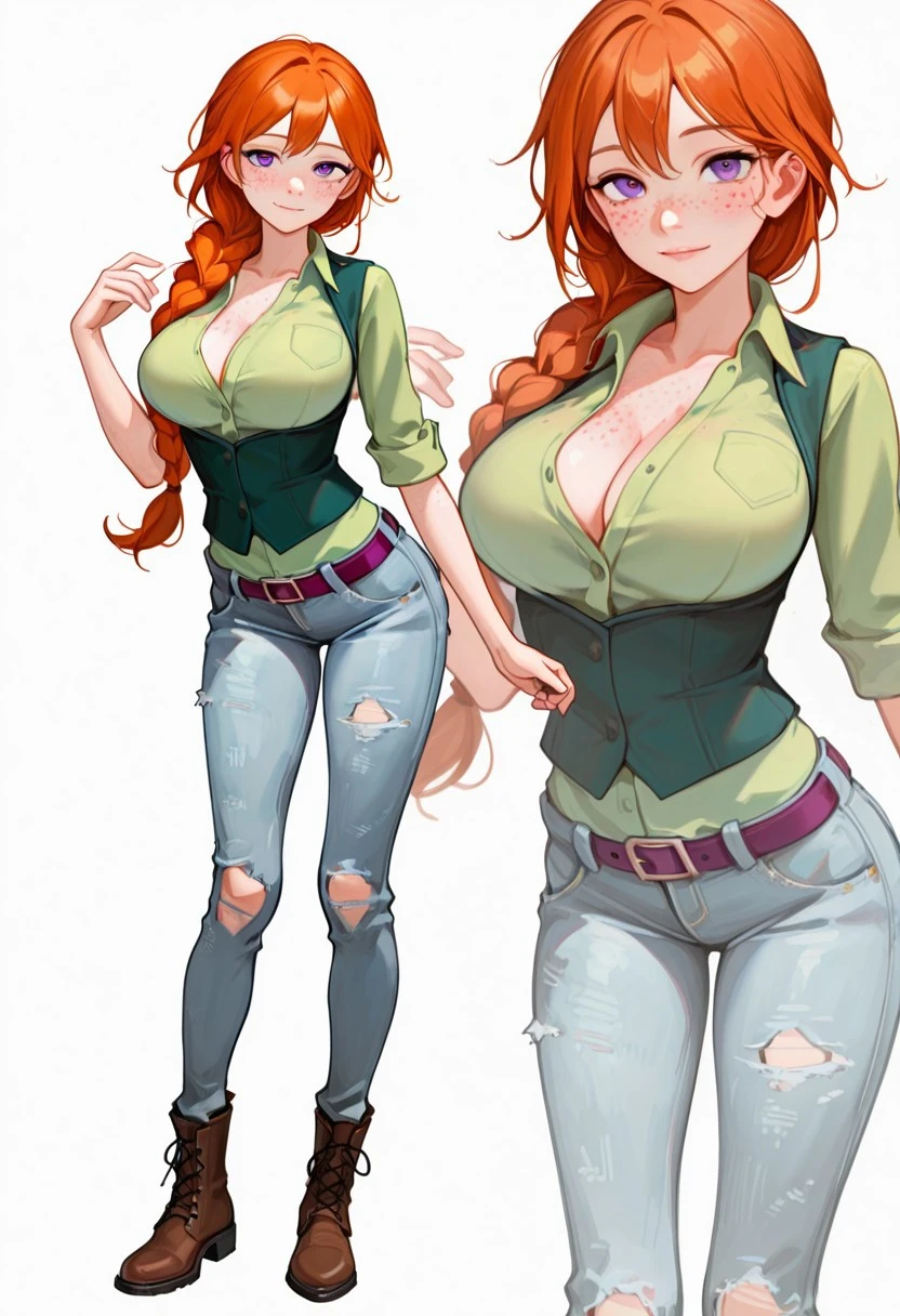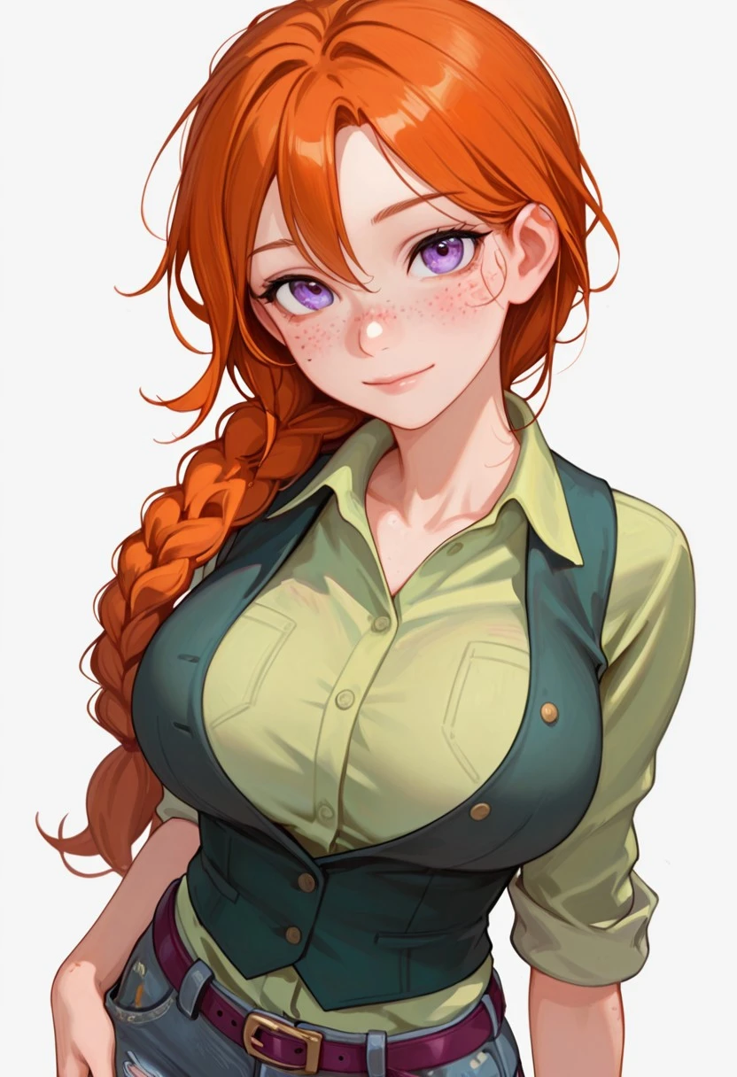 L34h_sdv, violet eyes, orange hair, single hair braid, hair braid, single braid, freckles, large breasts,