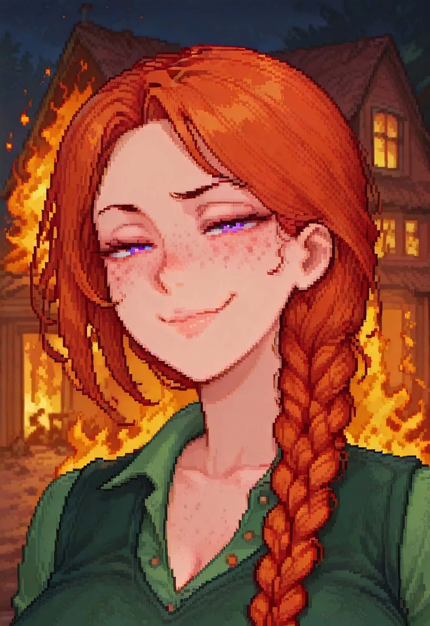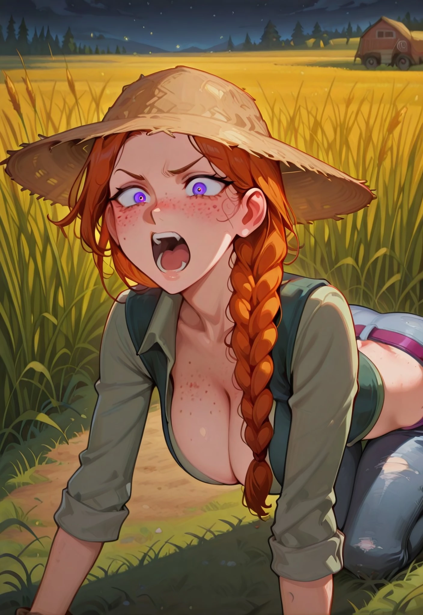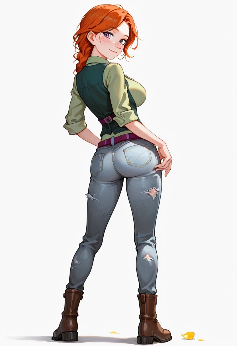 L34h_sdv, violet eyes, orange hair, single hair braid, hair braid, single braid, freckles, large breasts,
