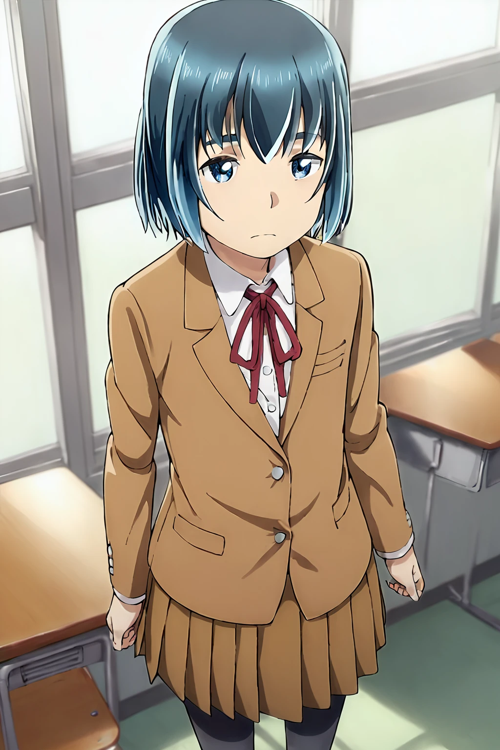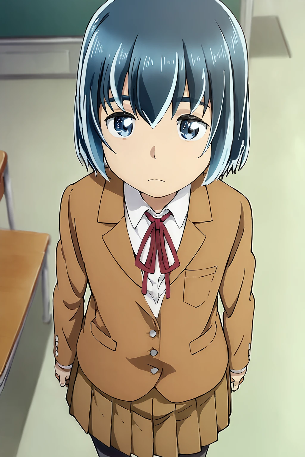 hina_hinamatsuri, brown school uniform, collared_shirt, red ribbon, brown skirt, black pantyhose, black shoes