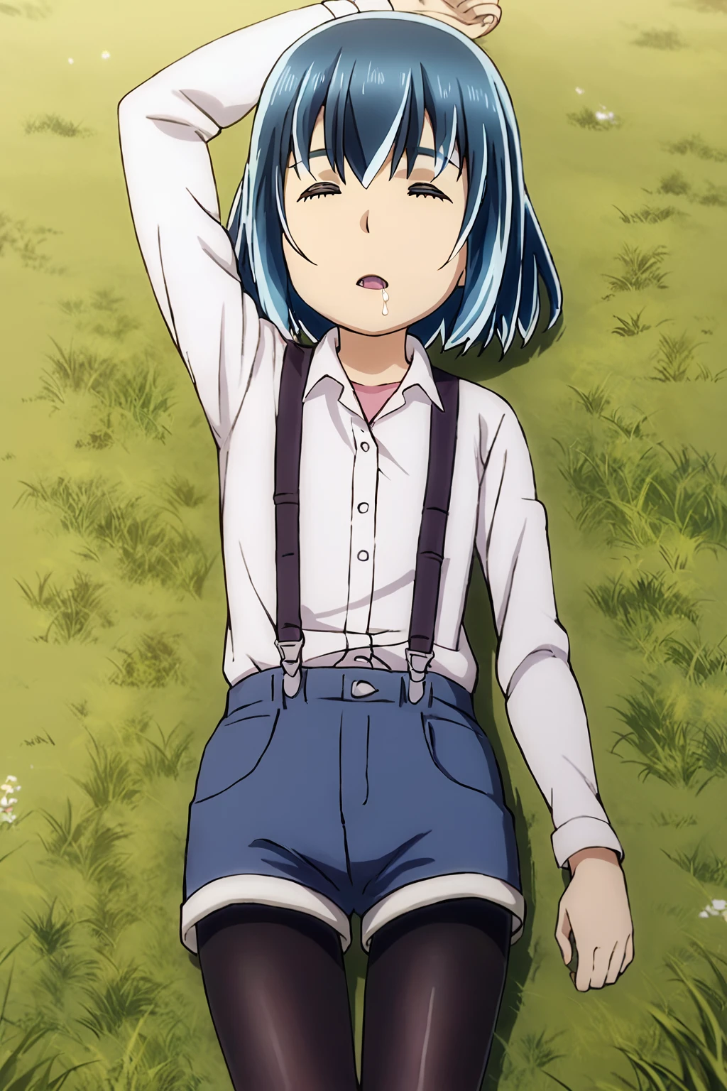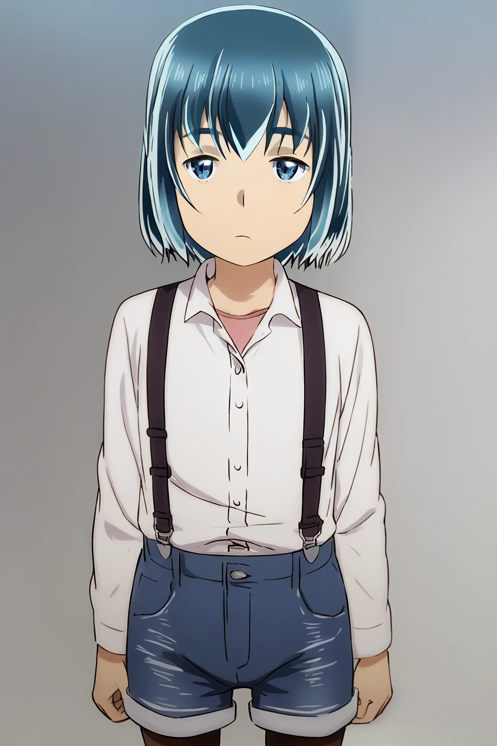 hina_hinamatsuri, shirt_with_suspenders, jeans shorts, pantyhose, shoes