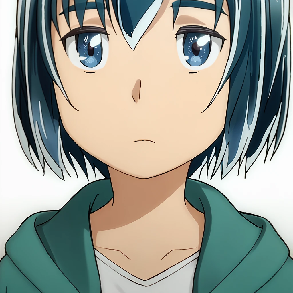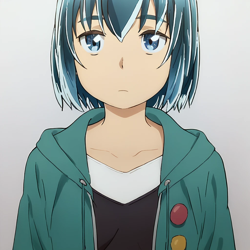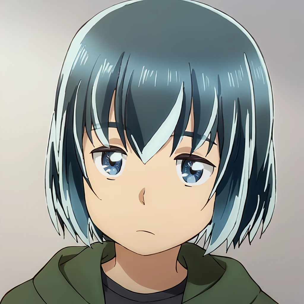 hina_hinamatsuri, military green hoodie, black shirt, expressionless