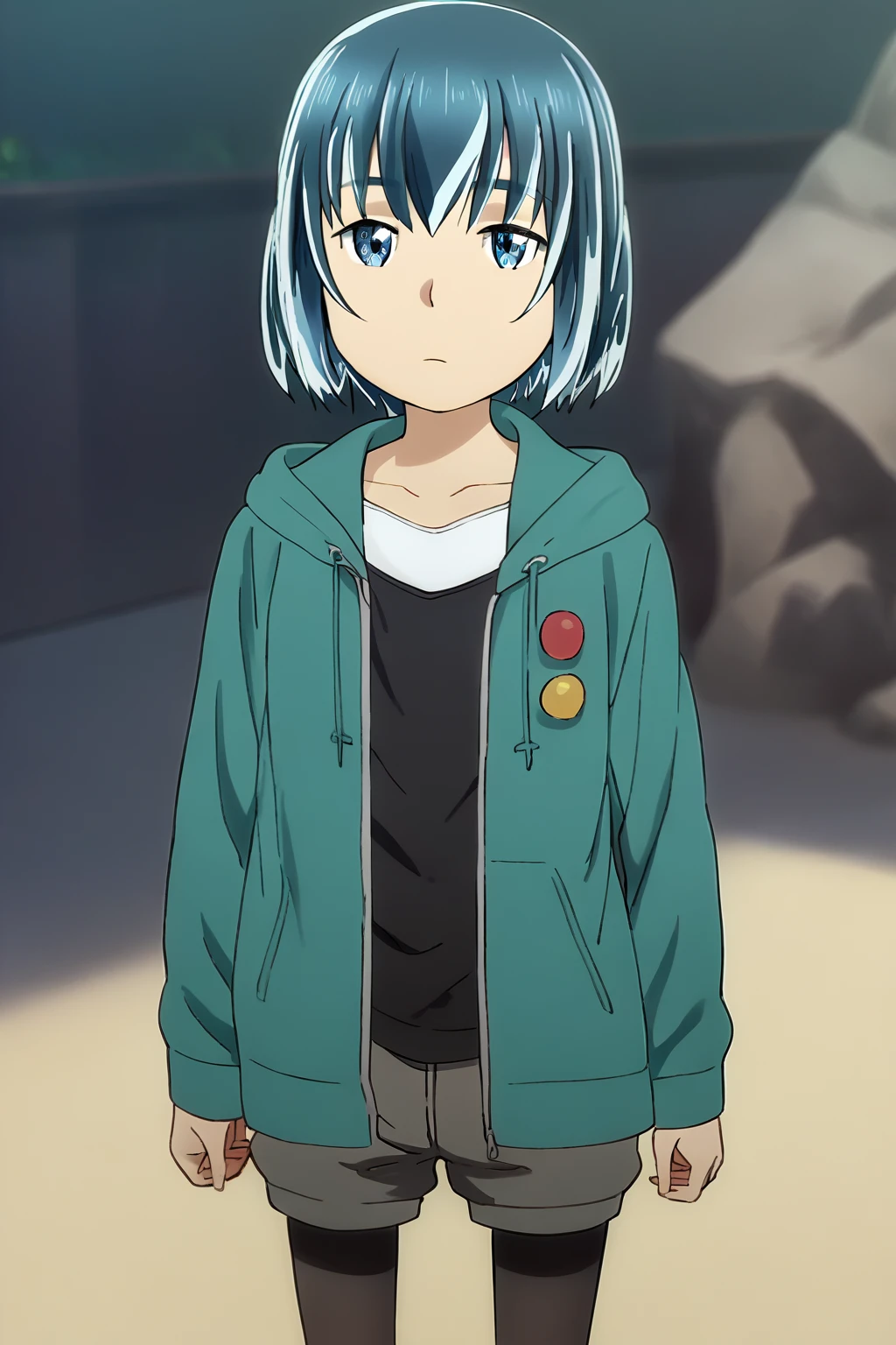 hina_hinamatsuri, green hooded jacket, v-neck shirt, grey shorts, pantyhose, grey shoes