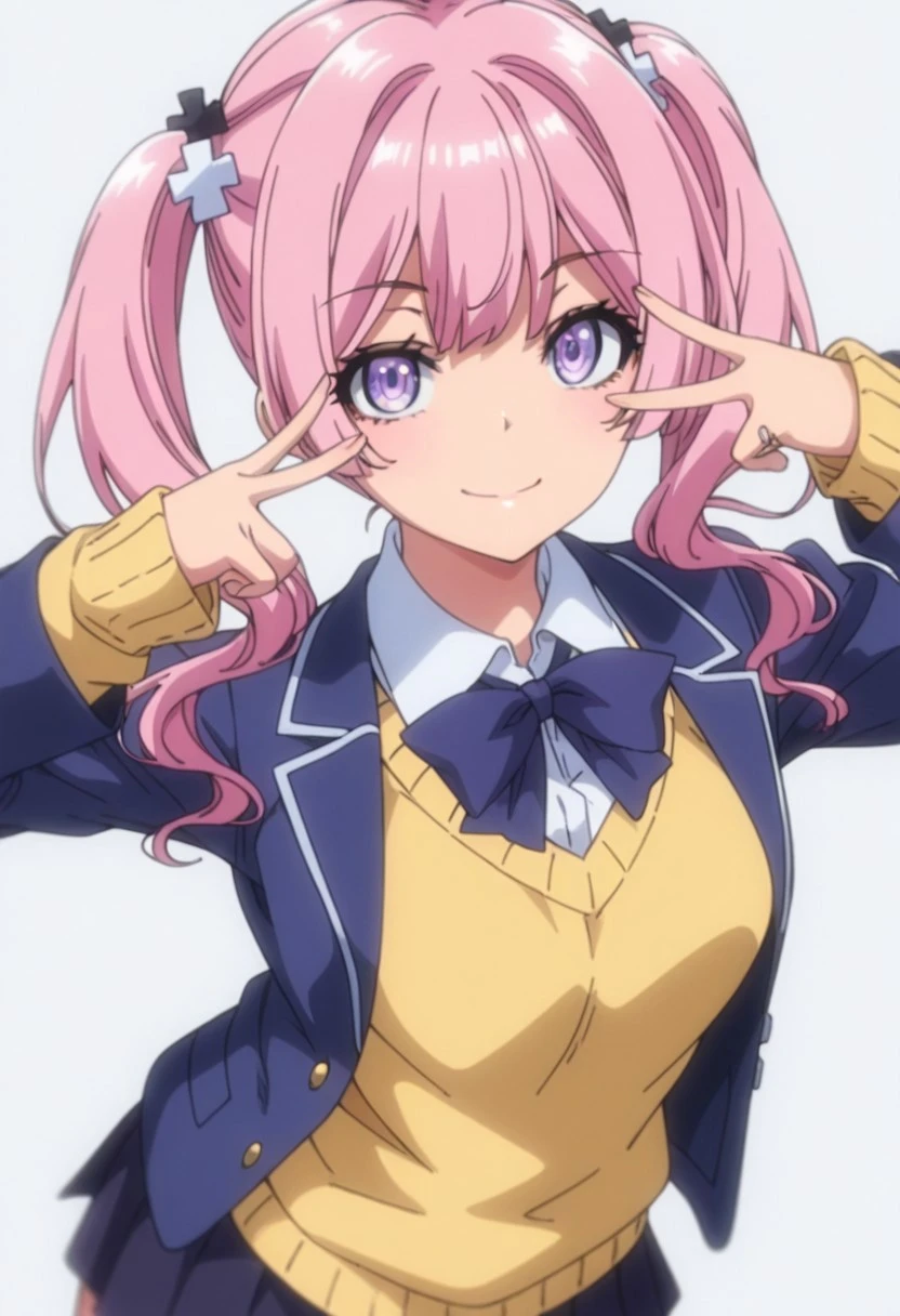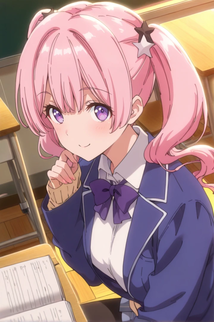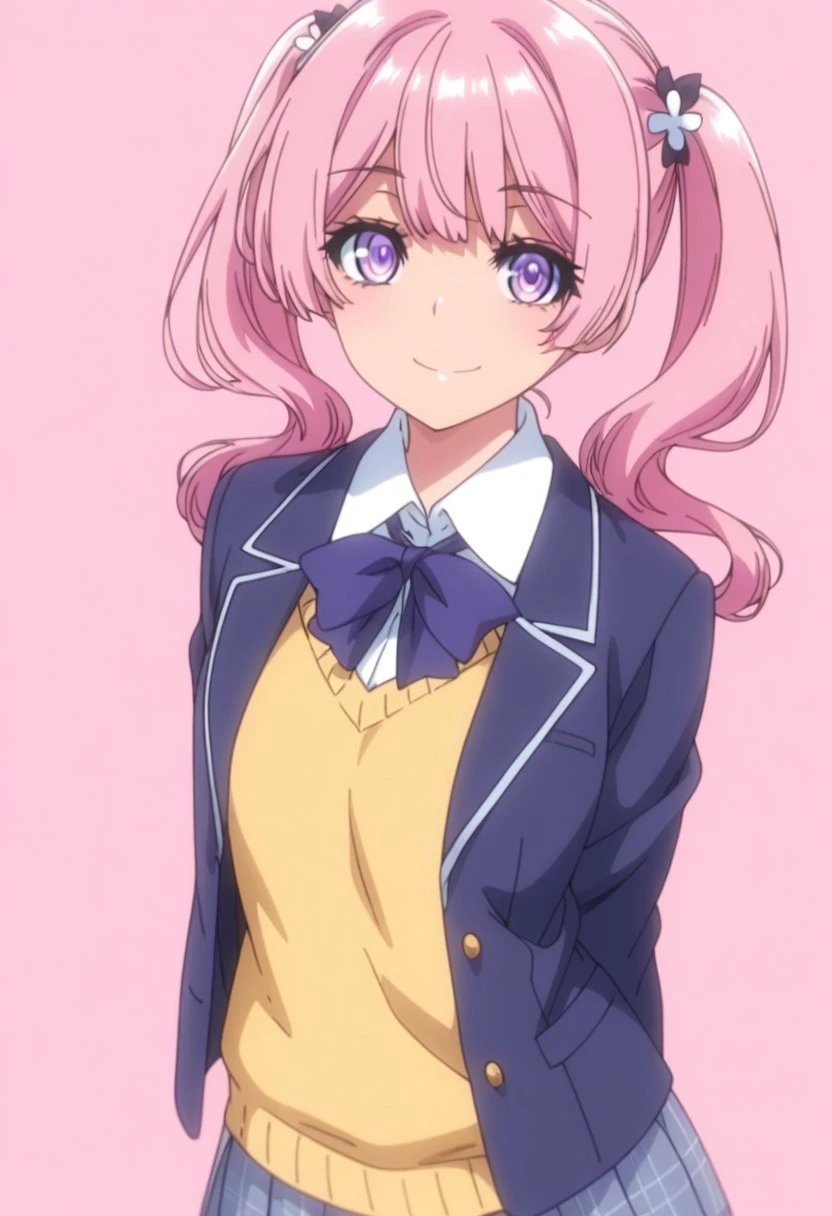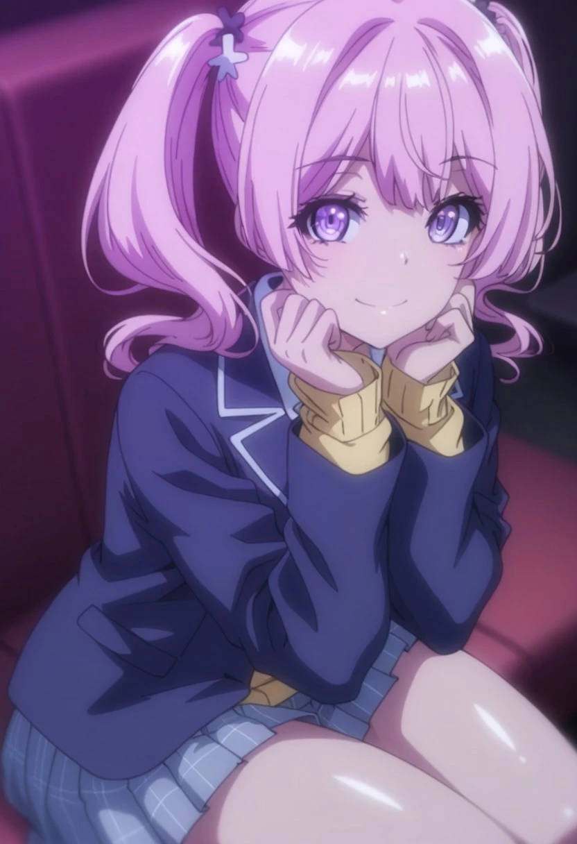 momo suzuki, 1girl, long hair, pink hair, twin tails, purple eyes