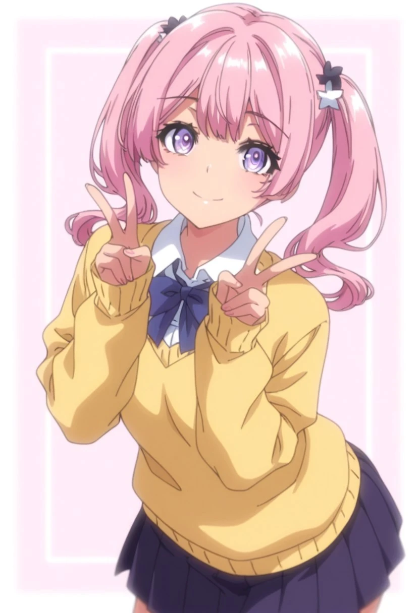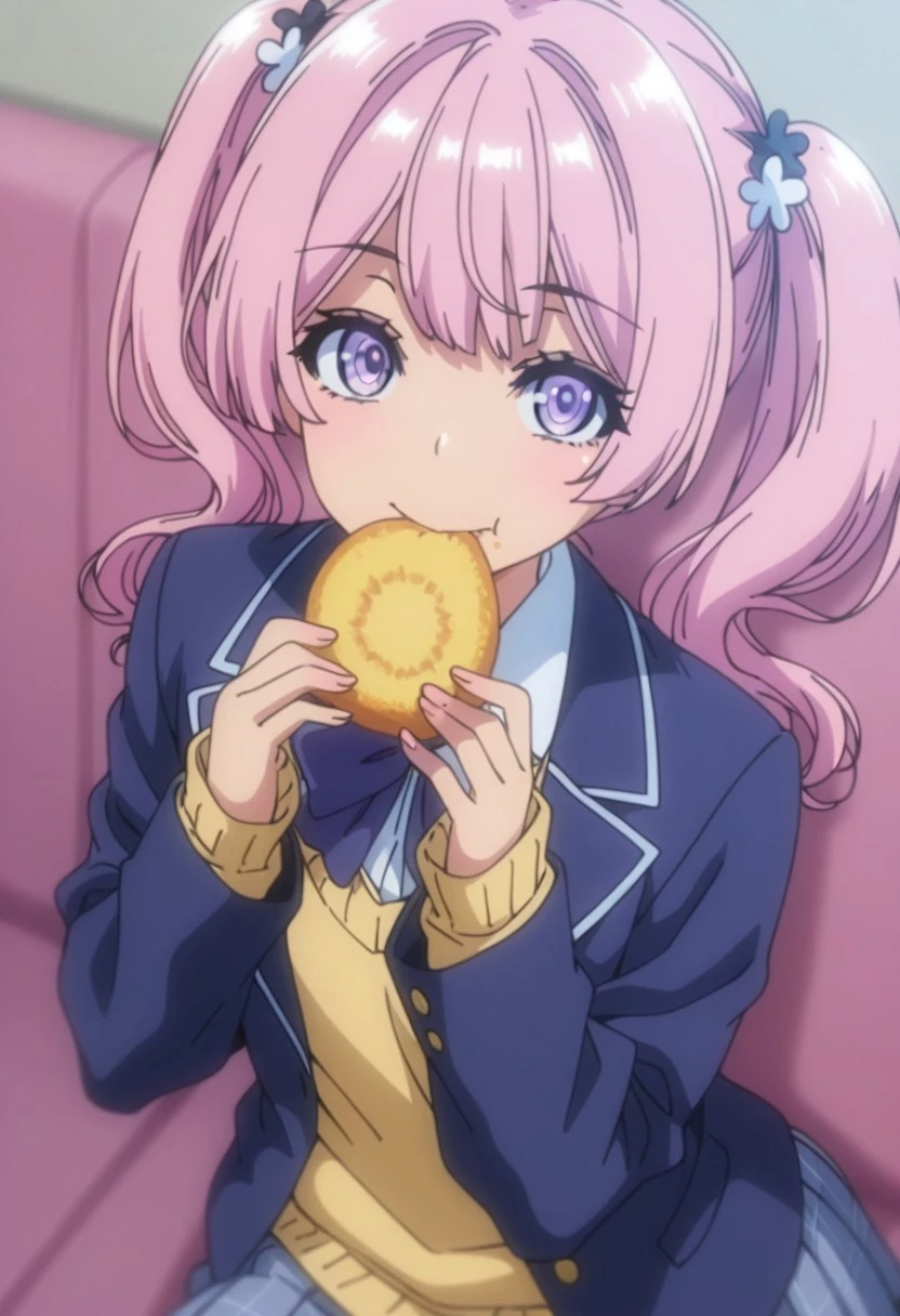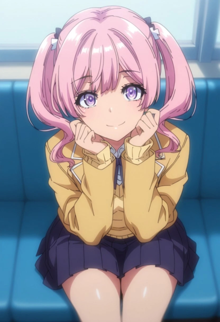 momo suzuki, 1girl, long hair, pink hair, twin tails, purple eyes