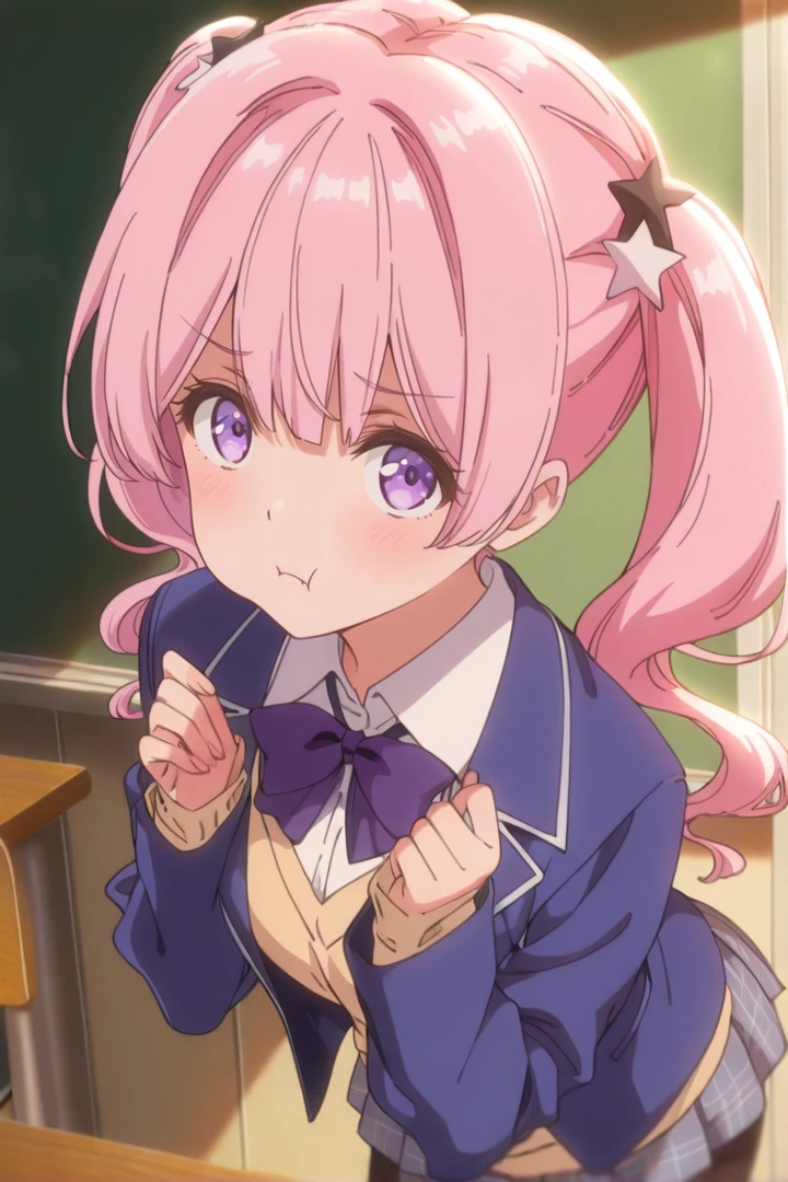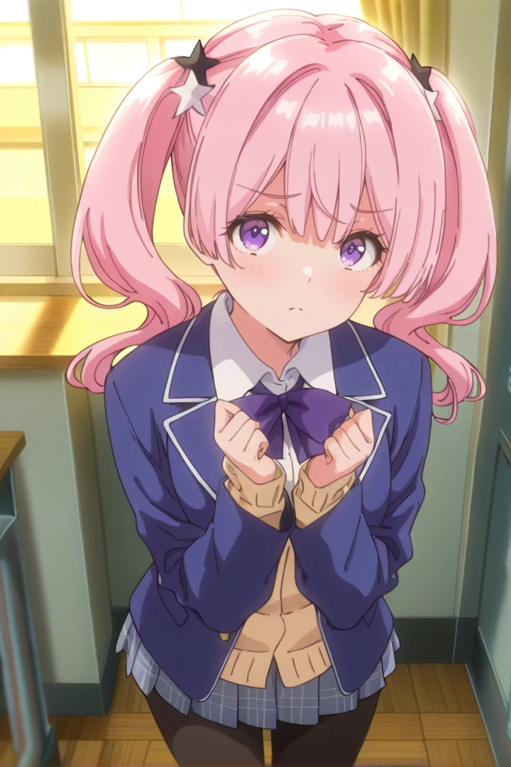 star hair ornament, school uniform, purple bowtie, blue jacket, blazer, collared shirt, white shirt, skirt, yellow vest, pantyhose