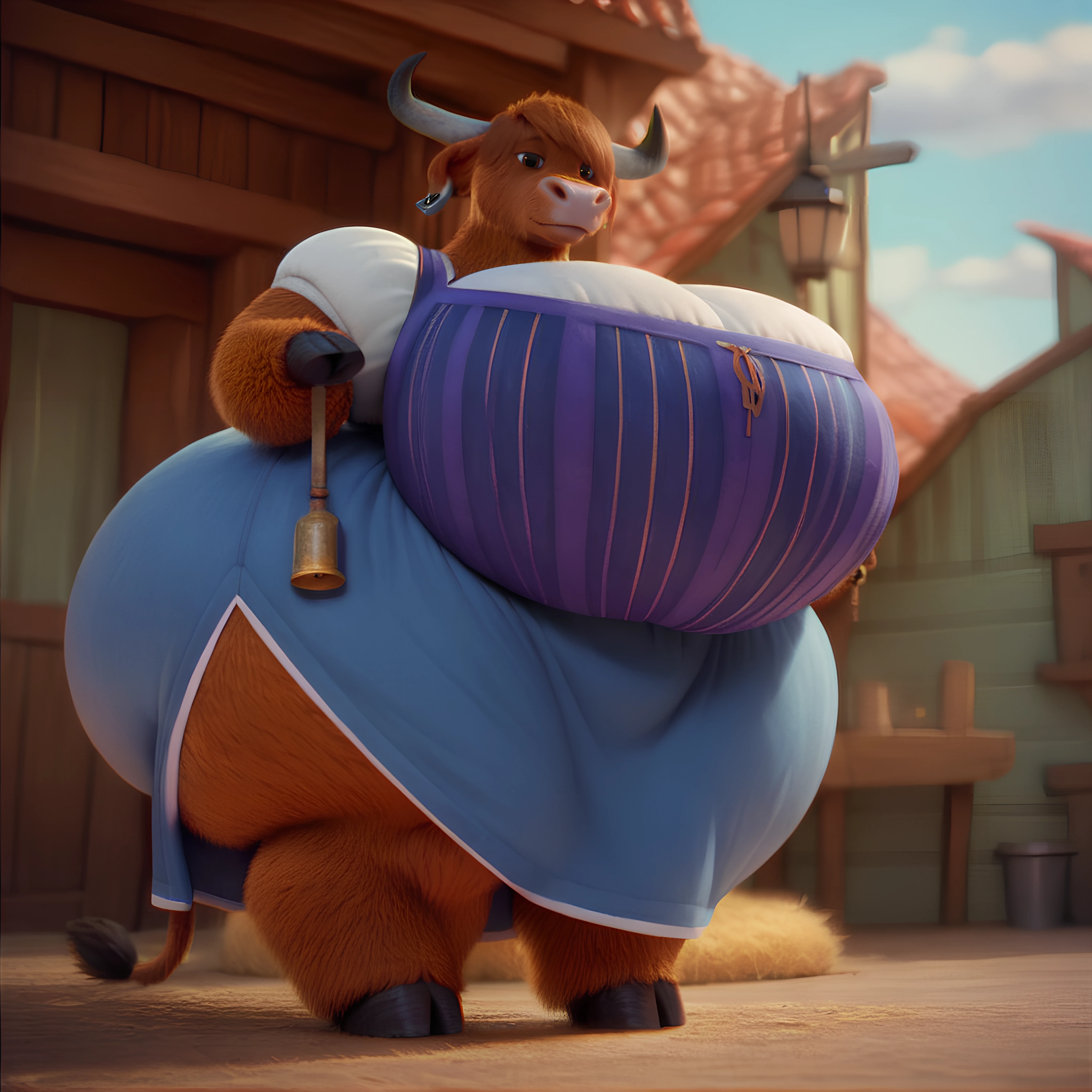overweight, female, cow, purple and blue dress, horns, brown hair, brown fur skin, earring
