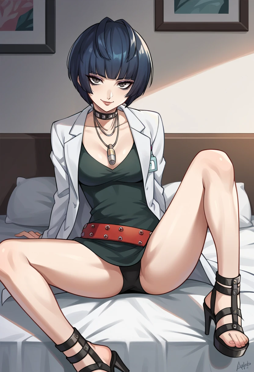 takemip5, short hair, black hair, blue hair, labcoat, black dress, belt, choker, necklace, cleavage, high heels, makeup, eyeliner,