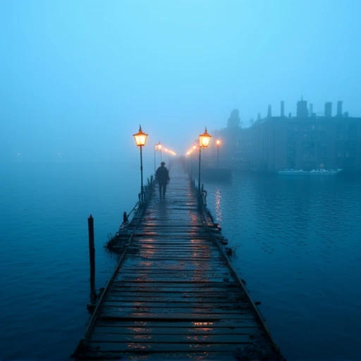 photo of xwx style, . The video depicts an abandoned industrial area surrounded by water. The buildings show signs of decay and neglect, with peeling paint and rusted structures. The area is overgrown with vegetation, and the water appears murky and polluted.Noir Urban Scene