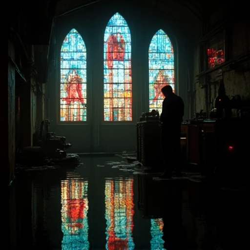 photo of xwx style, . The video depicts two scuba divers exploring an abandoned, flooded building with ornate-filled walls and arches. The camera captures the divers from behind as they move through the water-laden hallway, their reflections visible on the wet floor.High-Tech Control Room