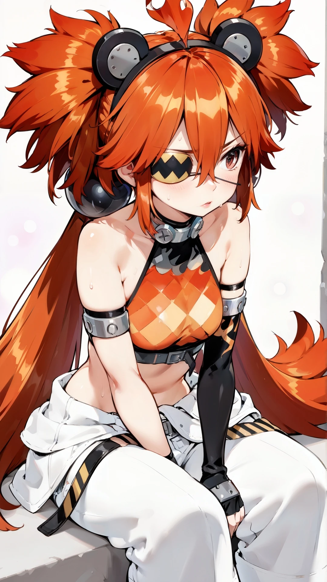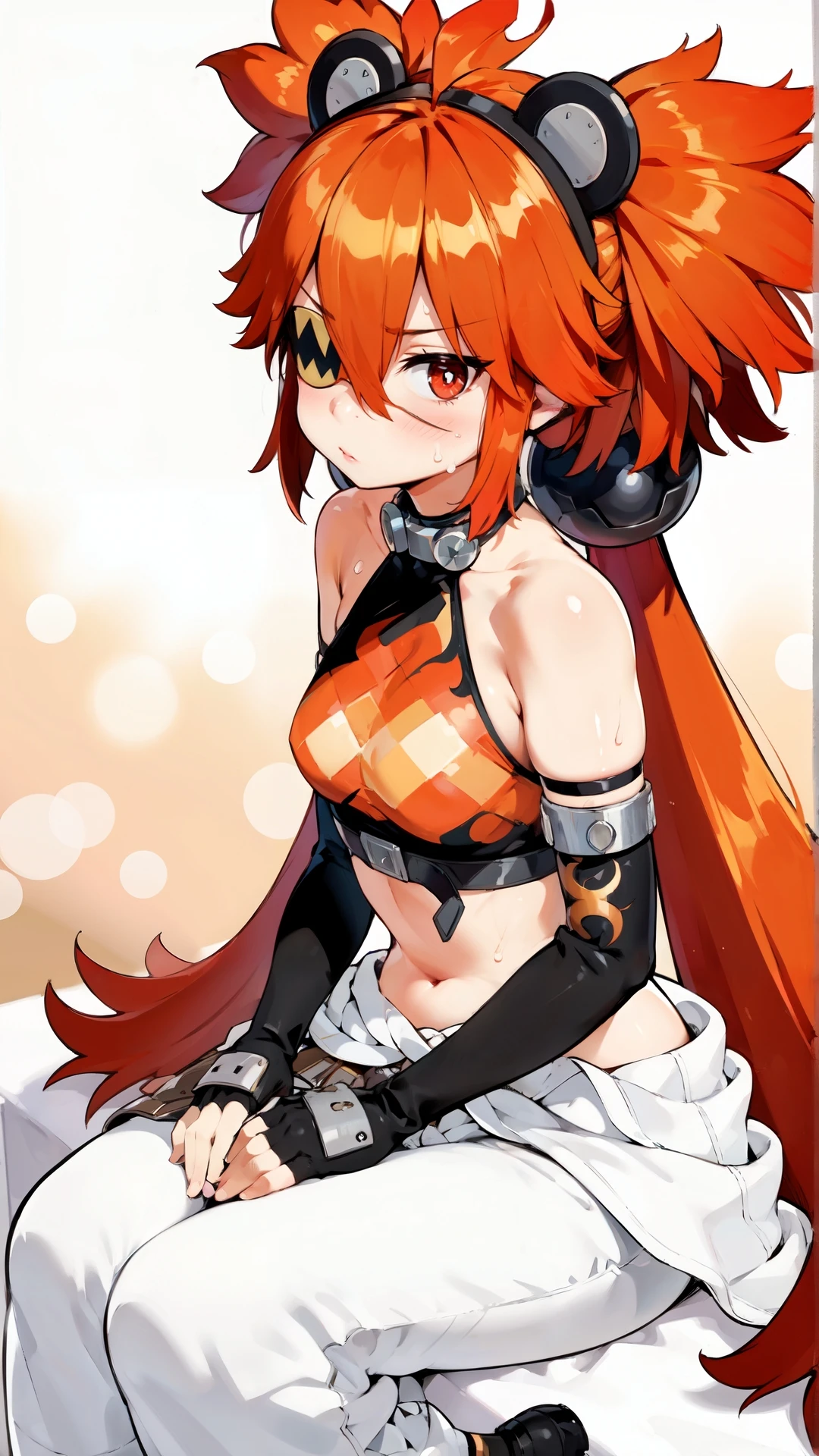koleda_belobog, an anime girl, 1girl, solo, long hair, simple background, red eyes, gloves, white background, animal ears, hair between eyes, bare shoulders, sitting, very long hair, closed mouth, red hair, sweat, black gloves, elbow gloves, pants, fingerless gloves, black footwear, crop top, scar, scar on face, flame print,