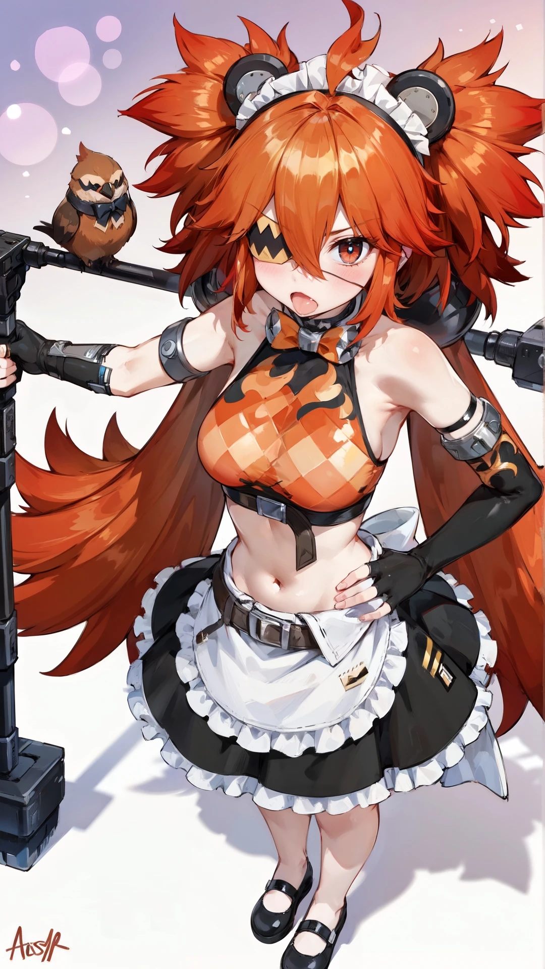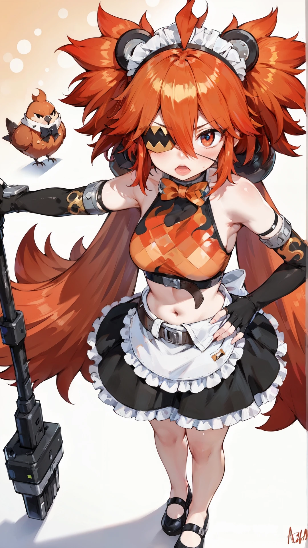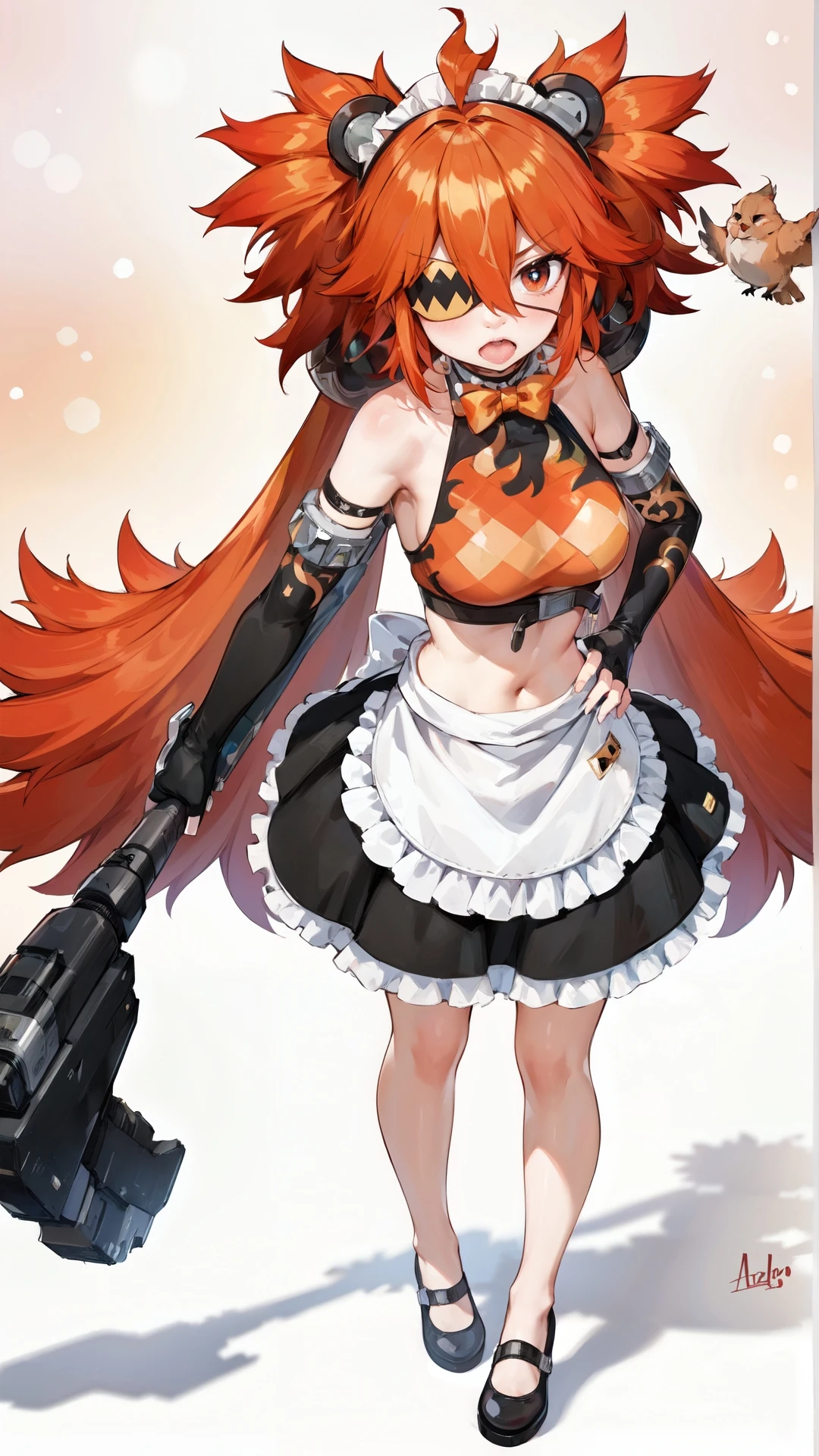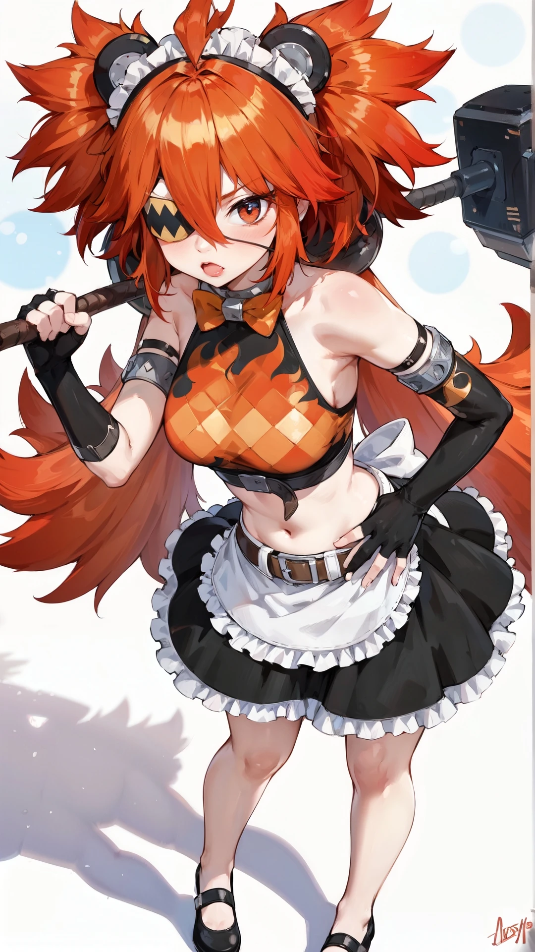 koleda_belobog, an anime girl, 1girl, solo, long hair, breasts, looking at viewer, blush, open mouth, bangs, skirt, simple background, shirt, red eyes, gloves, white background, bow, navel, holding, animal ears, hair between eyes, bare shoulders, very long hair, standing, weapon, ahoge, sidelocks, red hair, frills, shoes, sleeveless, black gloves, elbow gloves, fang, midriff, belt, signature, fingerless gloves, bowtie, black skirt, black footwear, apron, crop top, hand on hip, maid headdress, black shirt, sleeveless shirt, shadow, hair intakes, eyepatch, frilled skirt, waist apron, white apron, mary janes, maid apron, frilled apron, orange bow, bear ears, orange bowtie, arm belt