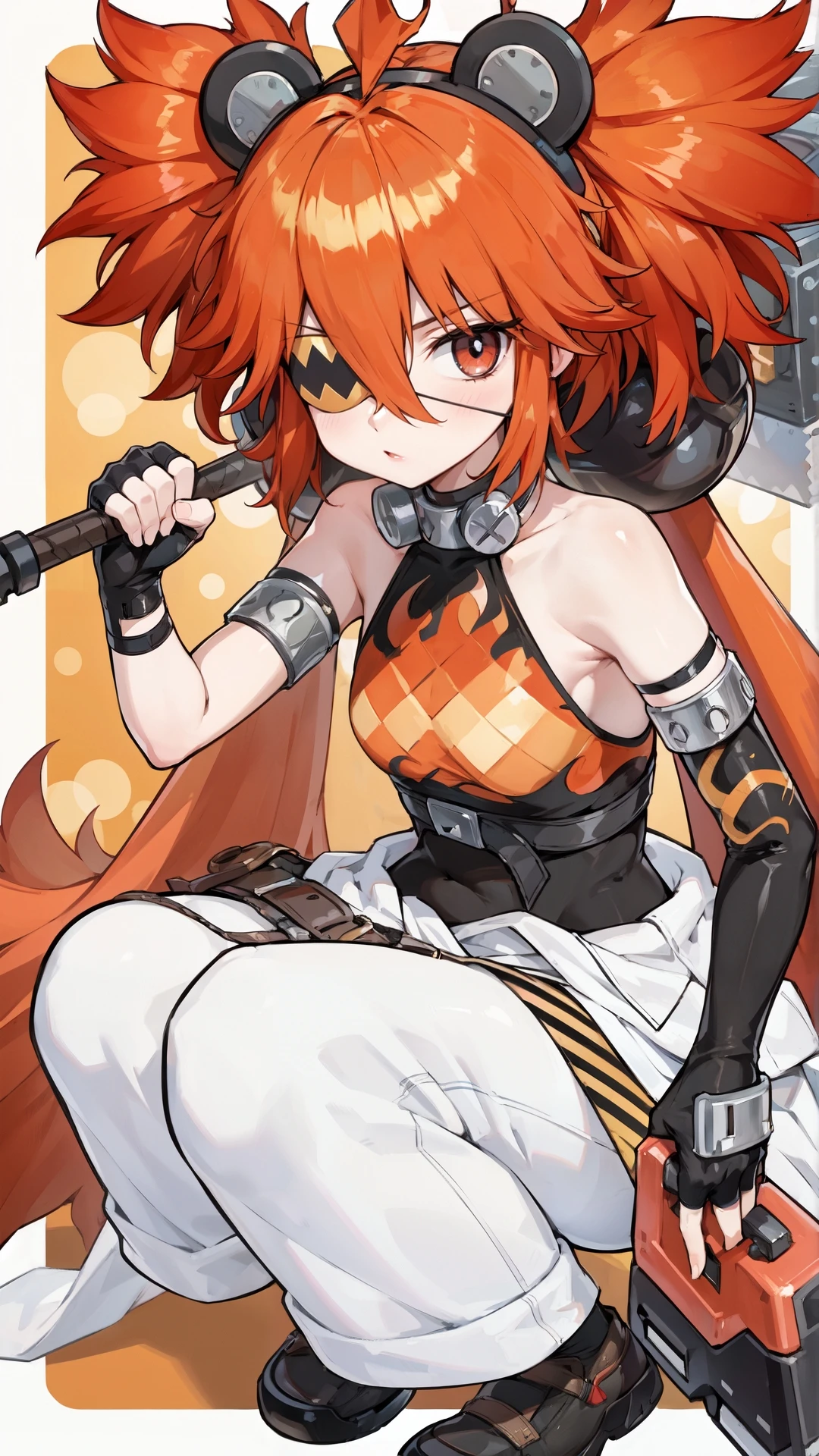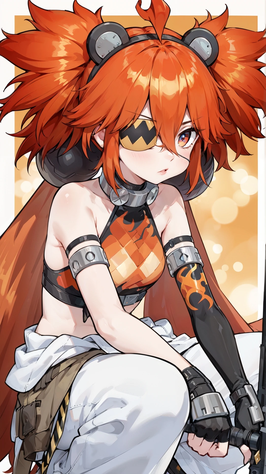 koleda_belobog, an anime girl, 1girl, solo, long hair, breasts, looking at viewer, red eyes, gloves, holding, animal ears, hair between eyes, bare shoulders, twintails, upper body, weapon, red hair, small breasts, parted lips, sleeveless, black gloves, fingerless gloves, holding weapon, fake animal ears, eyepatch,