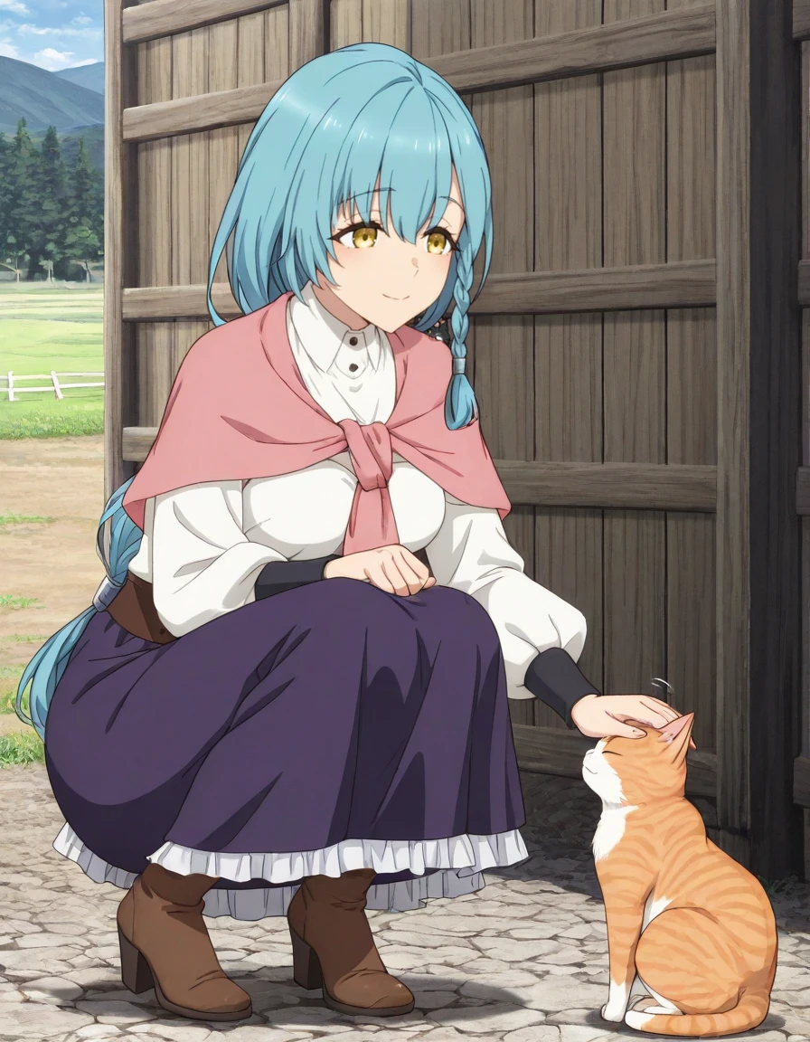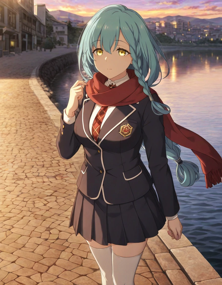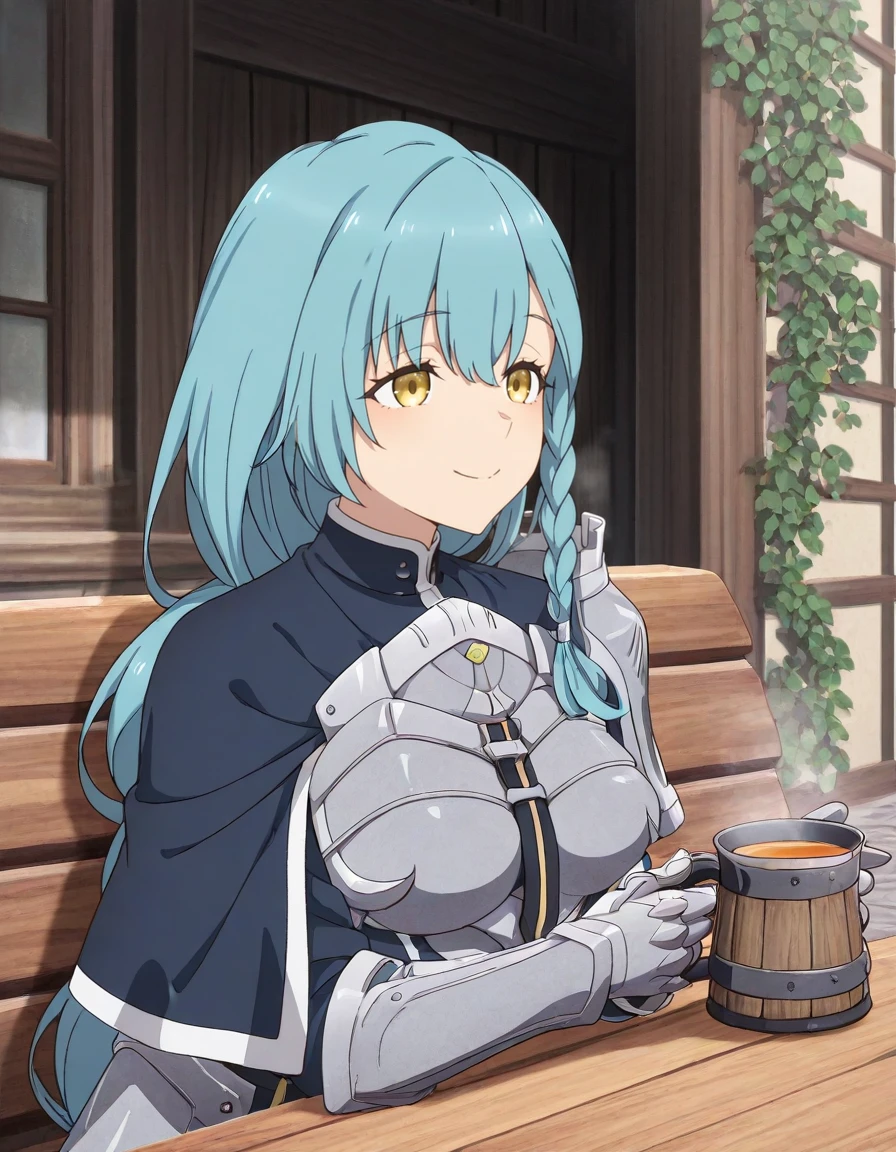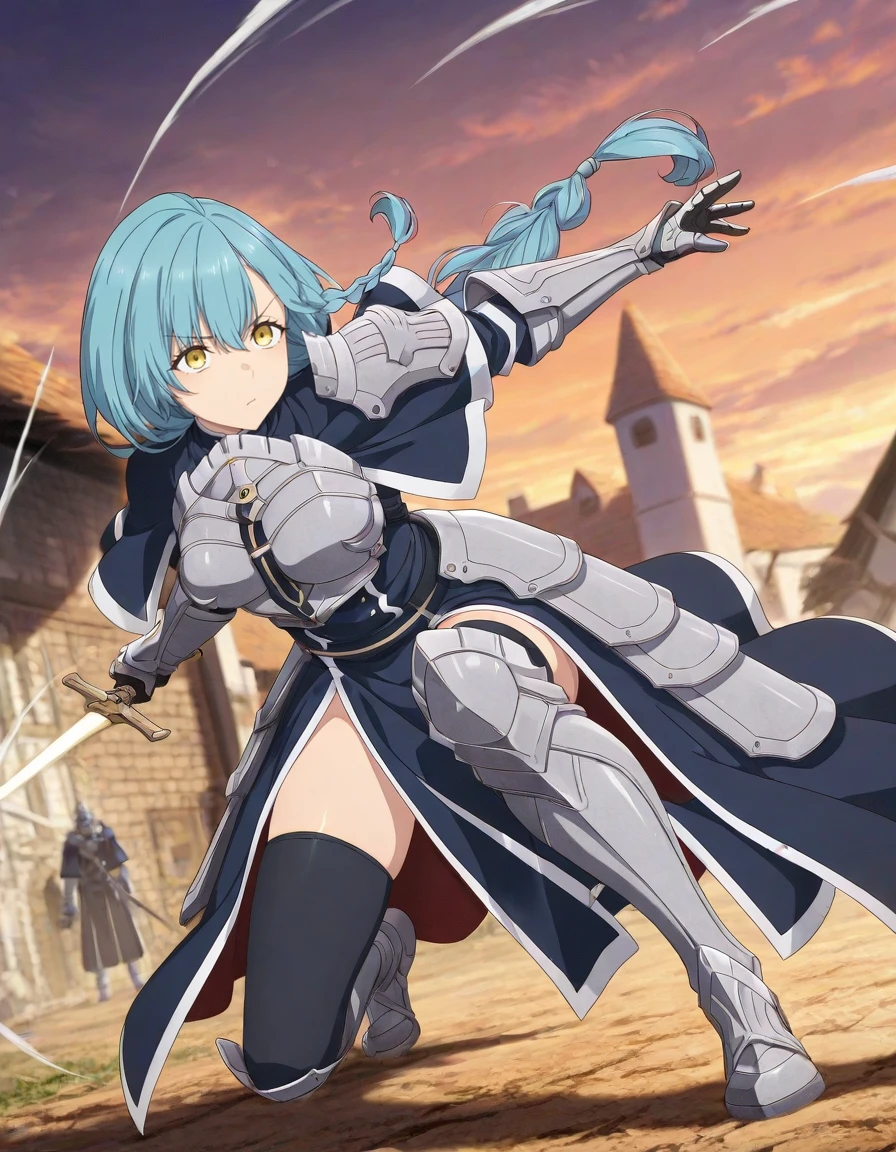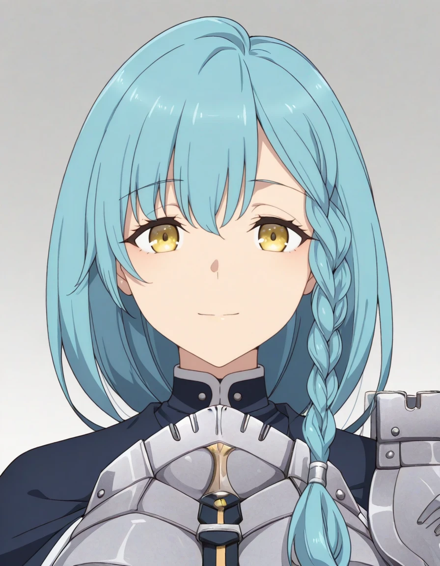 <lora:rose_marblehart-katainaka_no_ossan_s1-v2-ixl-anime-soralz:1>, rose marblehart (katainaka no ossan), long hair, aqua hair, side braid, braid, yellow eyesOutfit - Knight