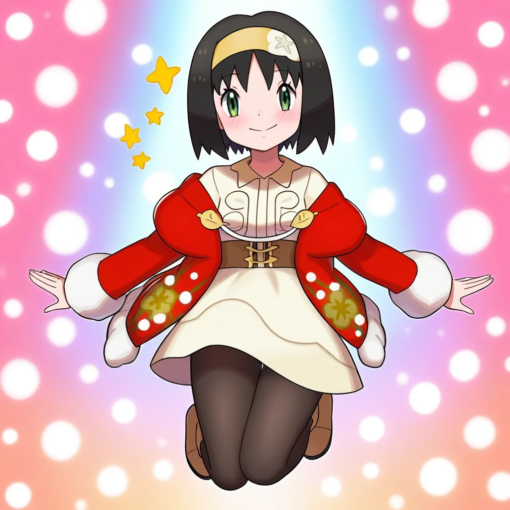 holerika, erika_\(pokemon\), black_hair, short_hair, bangs, hairband, yellow_hairband, long_sleeves, official_alternate_costume, dress. white_dress, jacket, red_jacket, floral_print, long_dress, pantyhose, black_pantyhose, brown_footwear