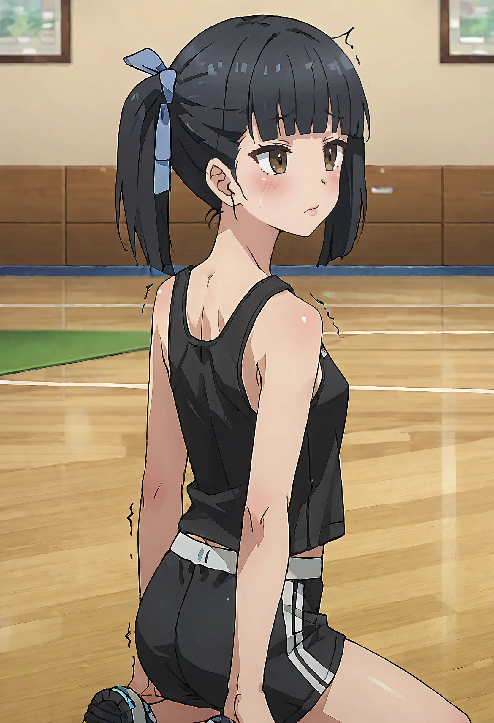 TNMMiya, brown eyes, black hair, hair ribbon, short hair, side ponytail, blunt bangs, ponytail, sidelocks,