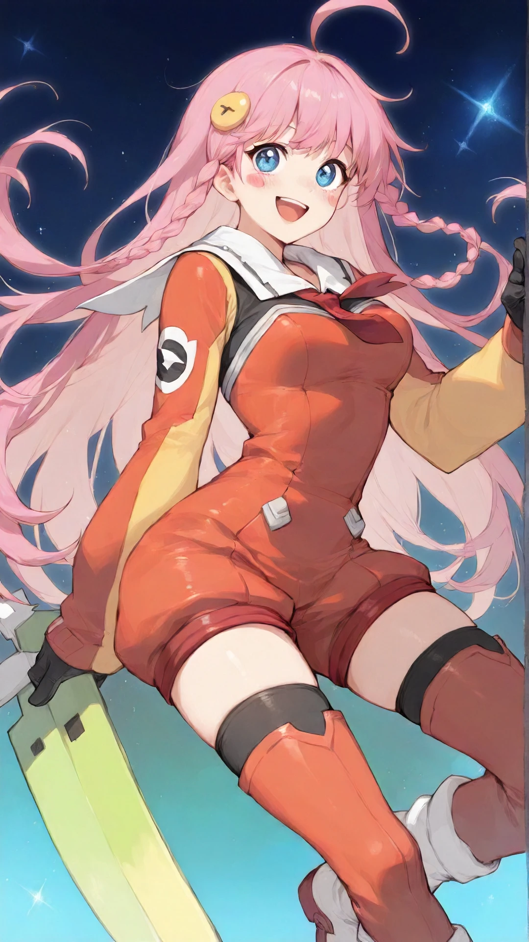 nono_gunbuster, an anime girl, 1girl, solo, long hair, smile, open mouth, blue eyes, thighhighs, pink hair, braid, ahoge, boots, symbol-shaped pupils, blush stickers, cross-shaped pupils