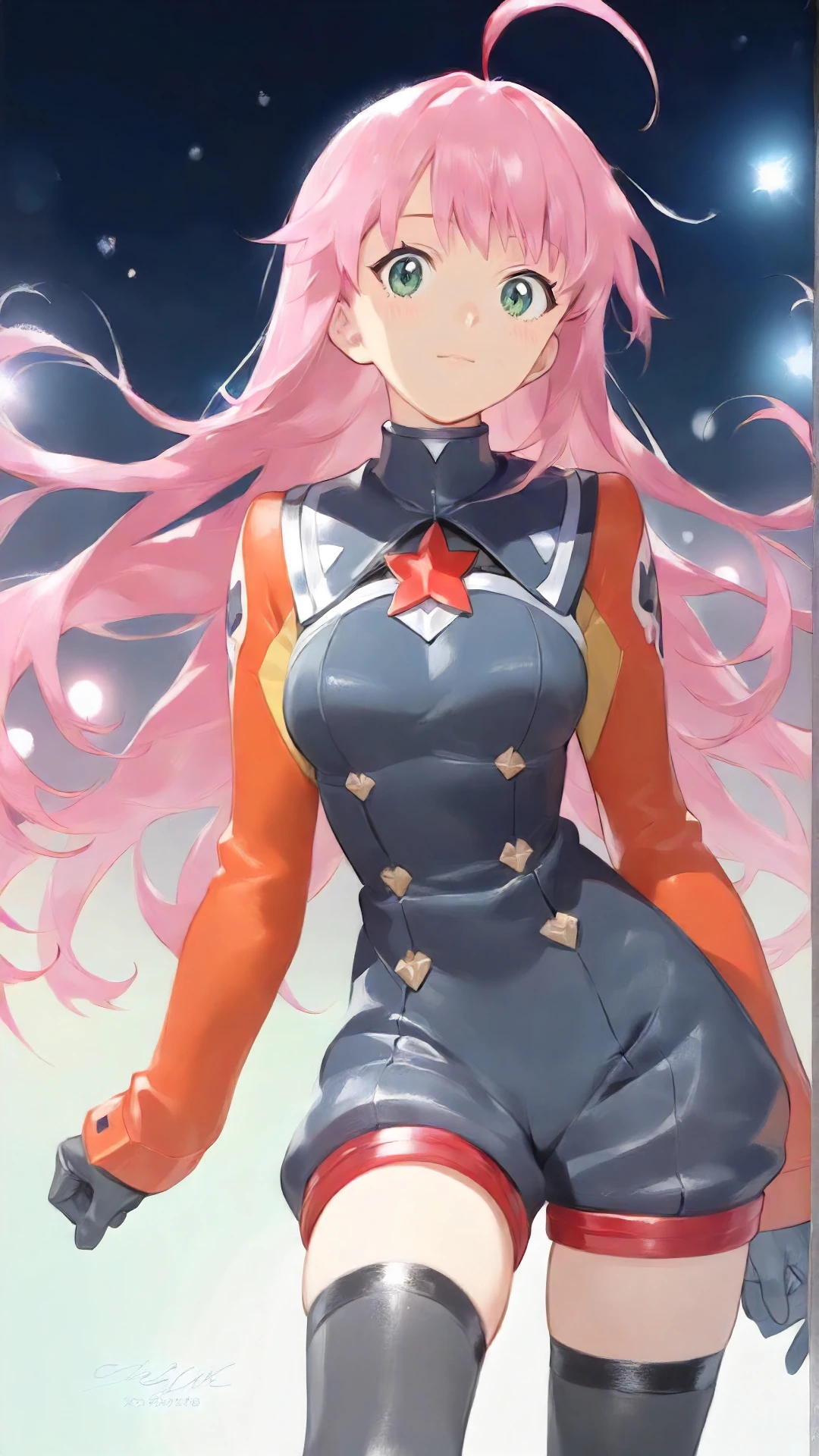 nono_gunbuster, an anime girl, 1girl, solo, long hair, looking at viewer, thighhighs, gloves, green eyes, pink hair, ahoge, traditional media