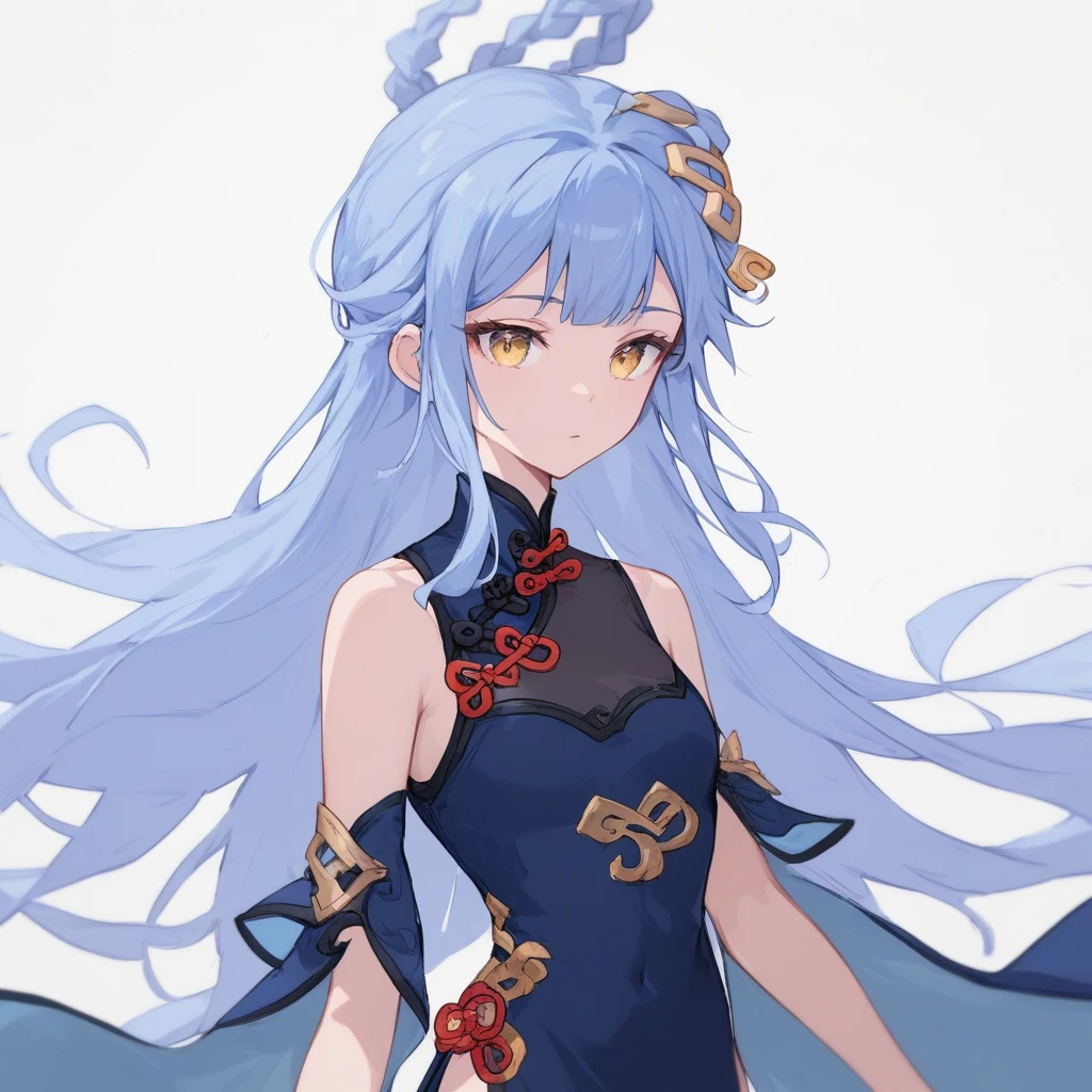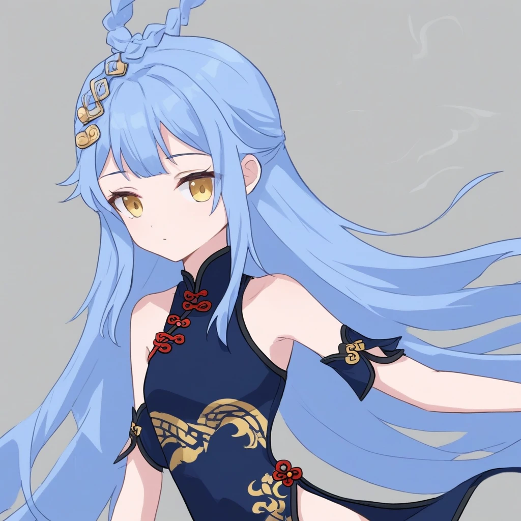 1girl, long hair, hair ornament, dress, bare shoulders, blue hair, yellow eyes, braid, blue dress, chinese clothes, china dress, light blue hair,