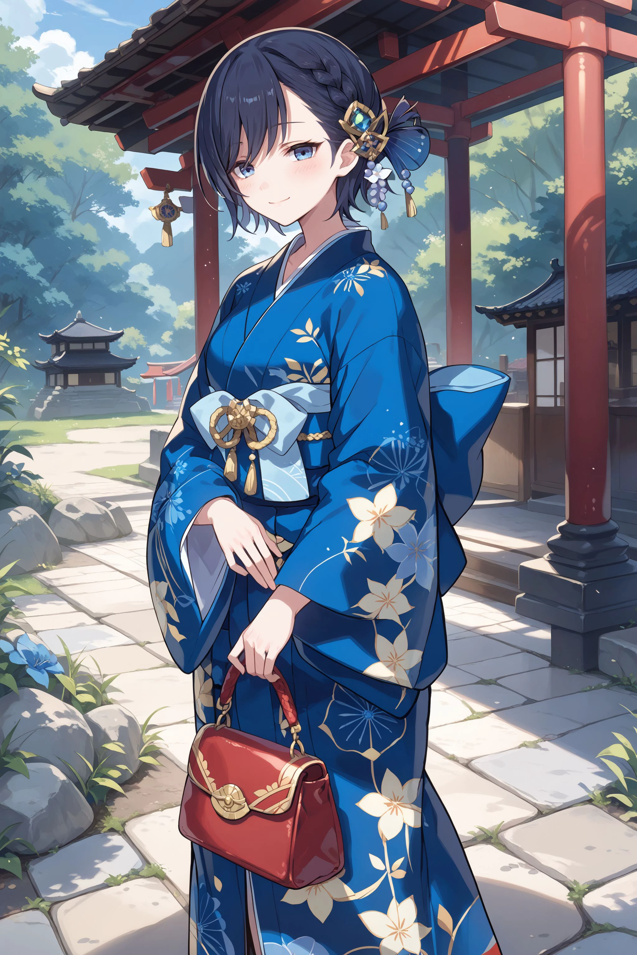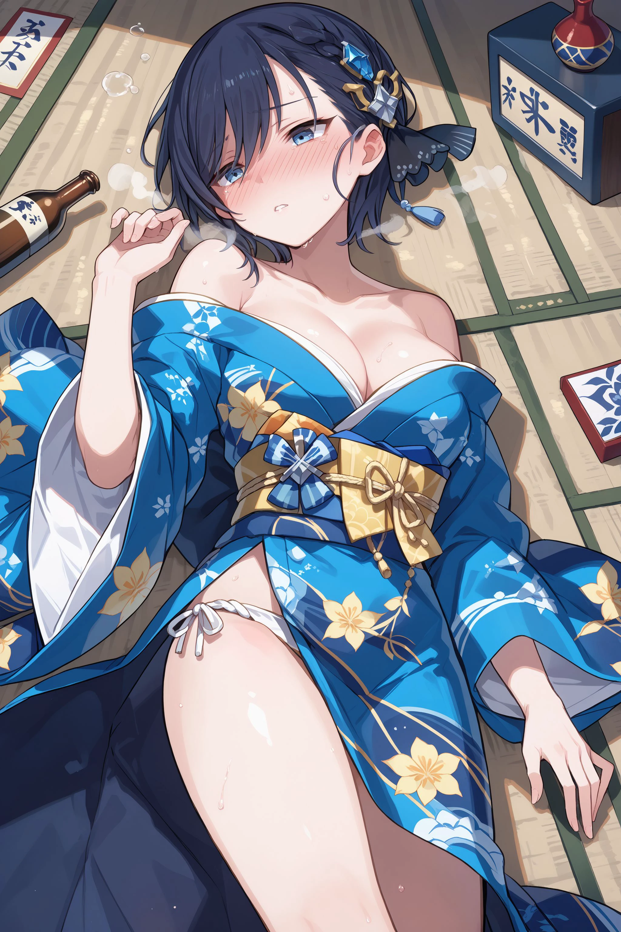 kimono: kimono, blue kimono, print kimono, long sleeves, wide sleeves, hair ornament