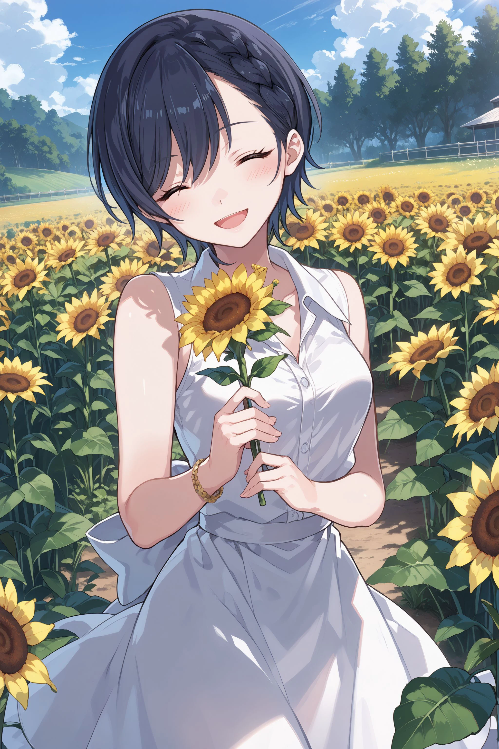 summer: white dress, dress shirt, ribbon, sleeveless, bracelet