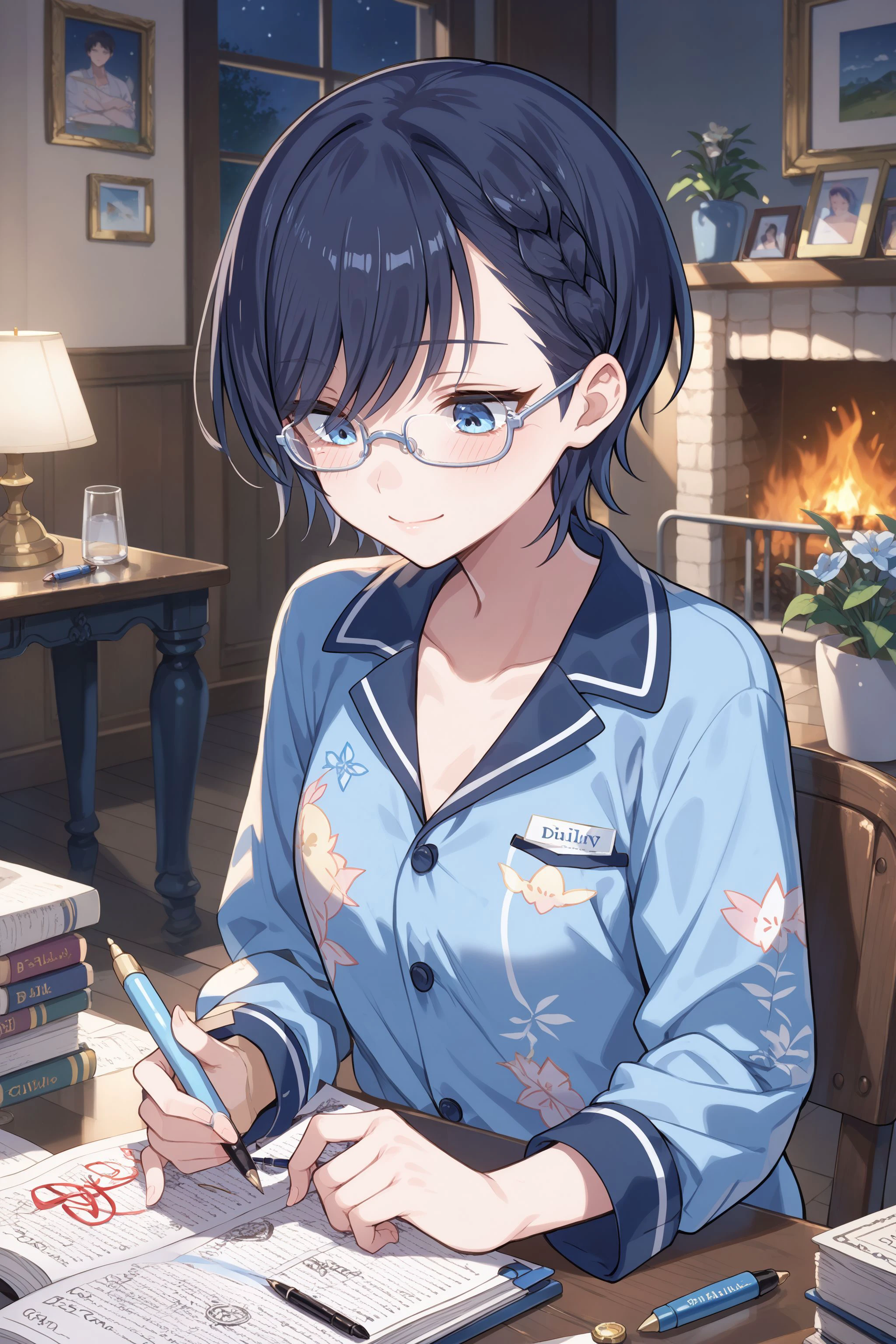 bangs, blue eyes, braid, eyes visible through hair, hair between eyes, hair bow, short hair