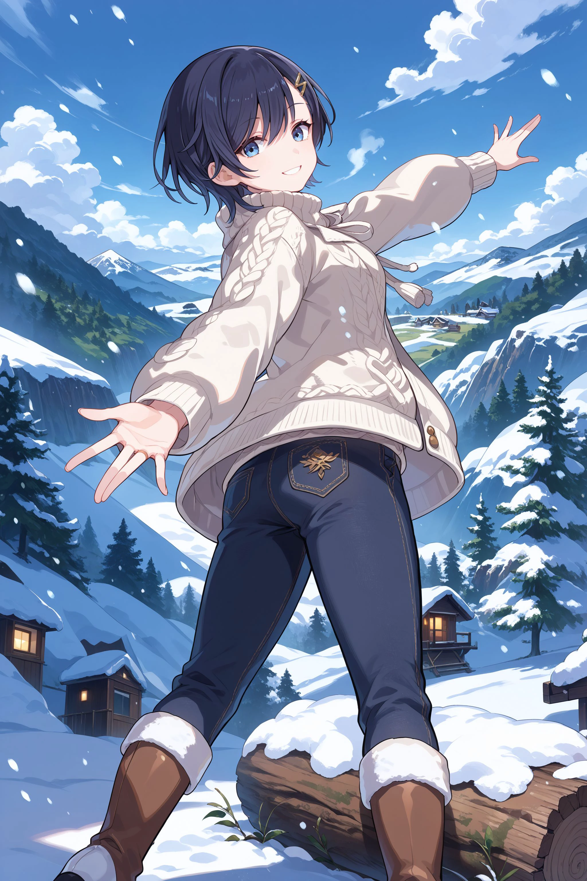 winter: white jacket, fur-trimmed jacket, open jacket, neklace, aran sweater, black sweater, turtleneck sweater, turtleneck, denim pants, knee boots