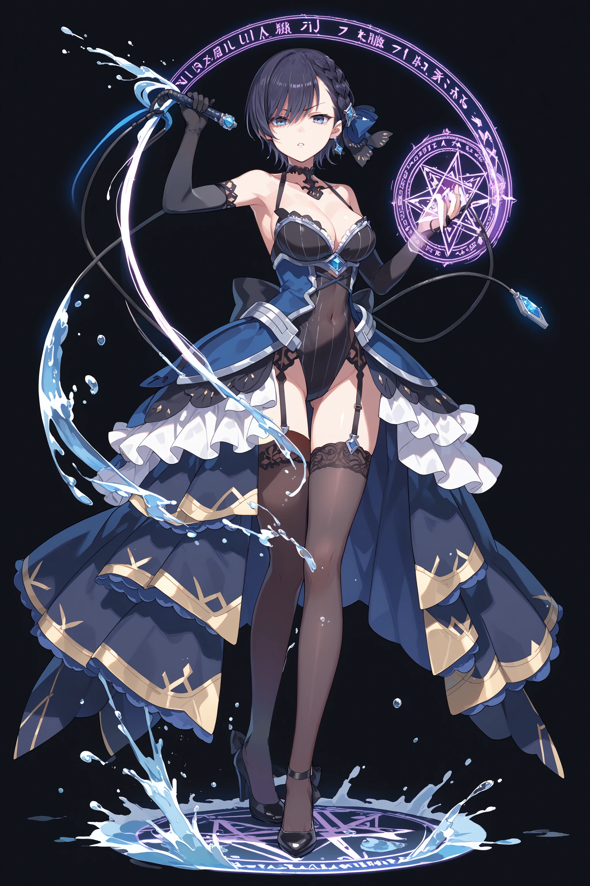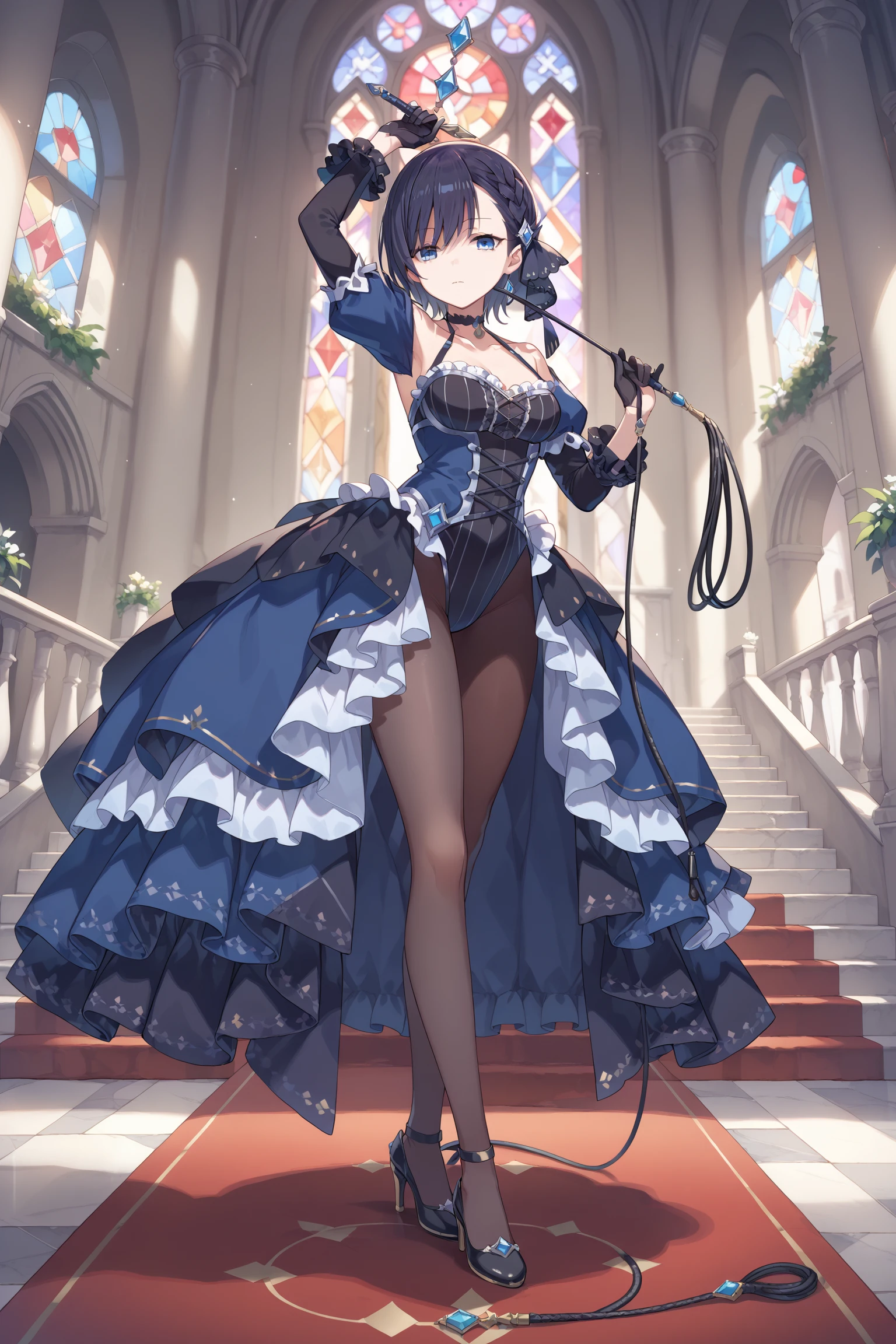 def-a: dress, blue dress, frills, halterneck, high heels, gem, choker,long sleeves, puffy sleeves, layered sleeves, black gloves, elbow gloves, black pantyhose, leotard