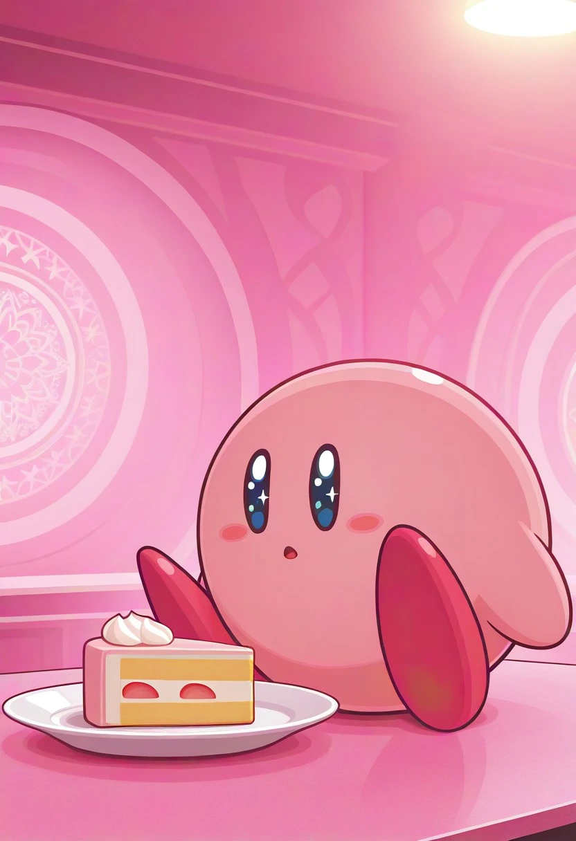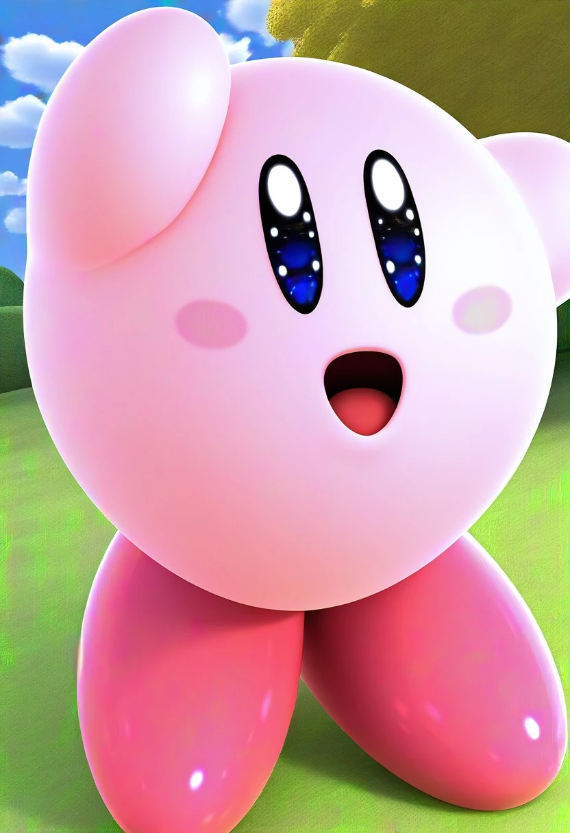 Kirby, ball-shaped body, round body, pink skin, black sclera, blue eyes, :D, blush, hot pink colored feet