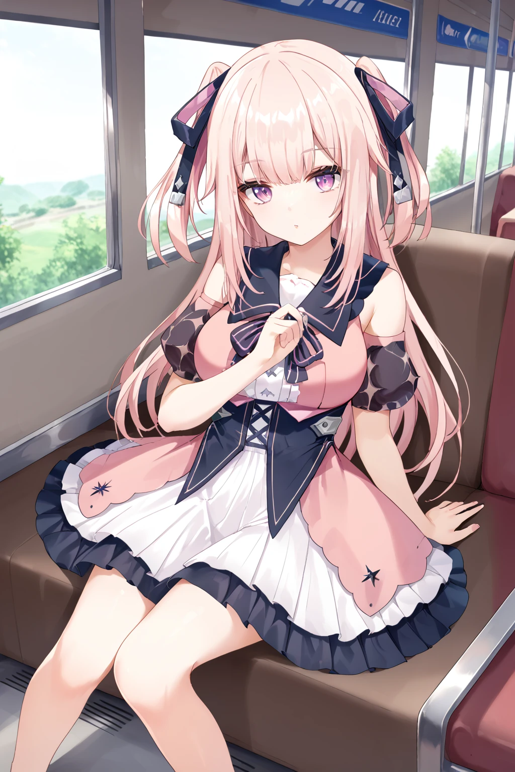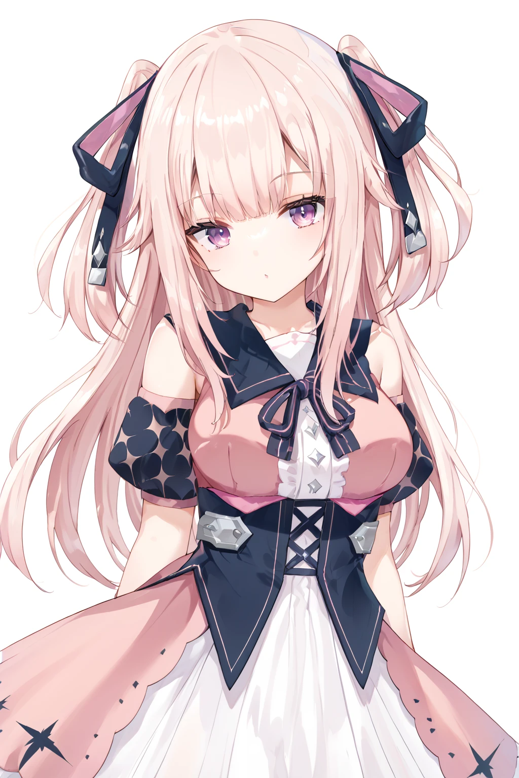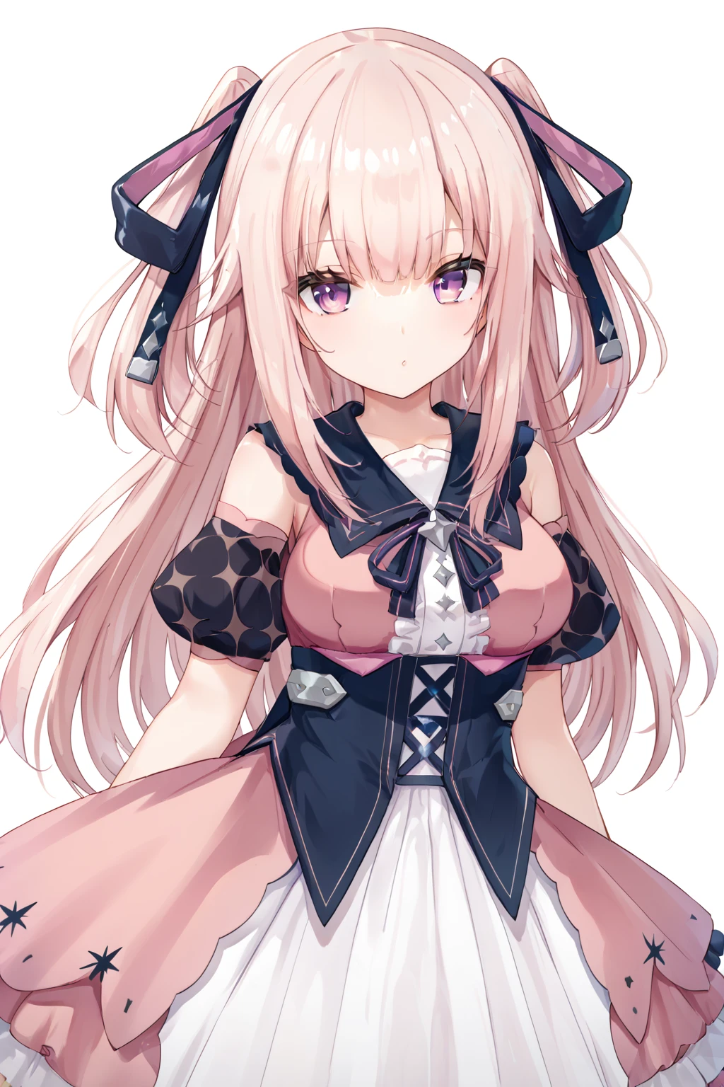iku hoshifuri, long hair, purple eyes, pink hair, virtual youtuber, looking at viewer, breasts, bangs, hair ribbon, ribbon, full body, dress, detached sleeves, pink dress,