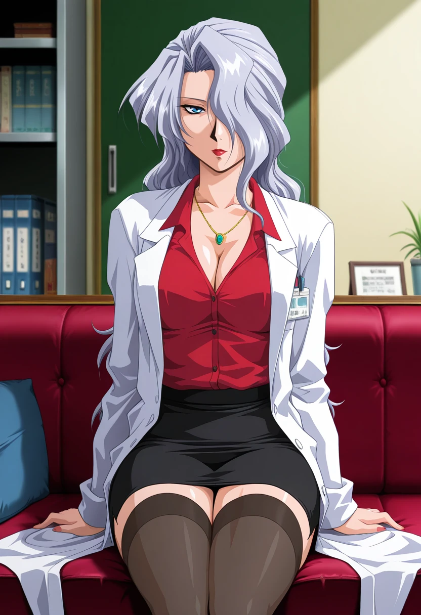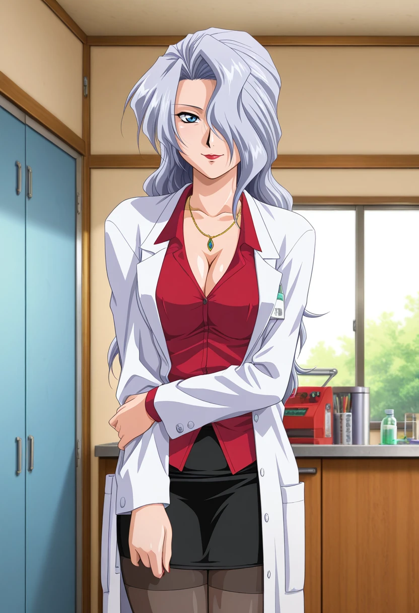 necklace, cleavage, lab coat, red dress shirt, untucked shirt, black pencil skirt, black thighhighs, high heels,
