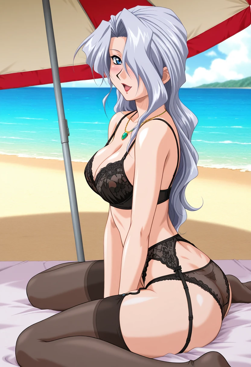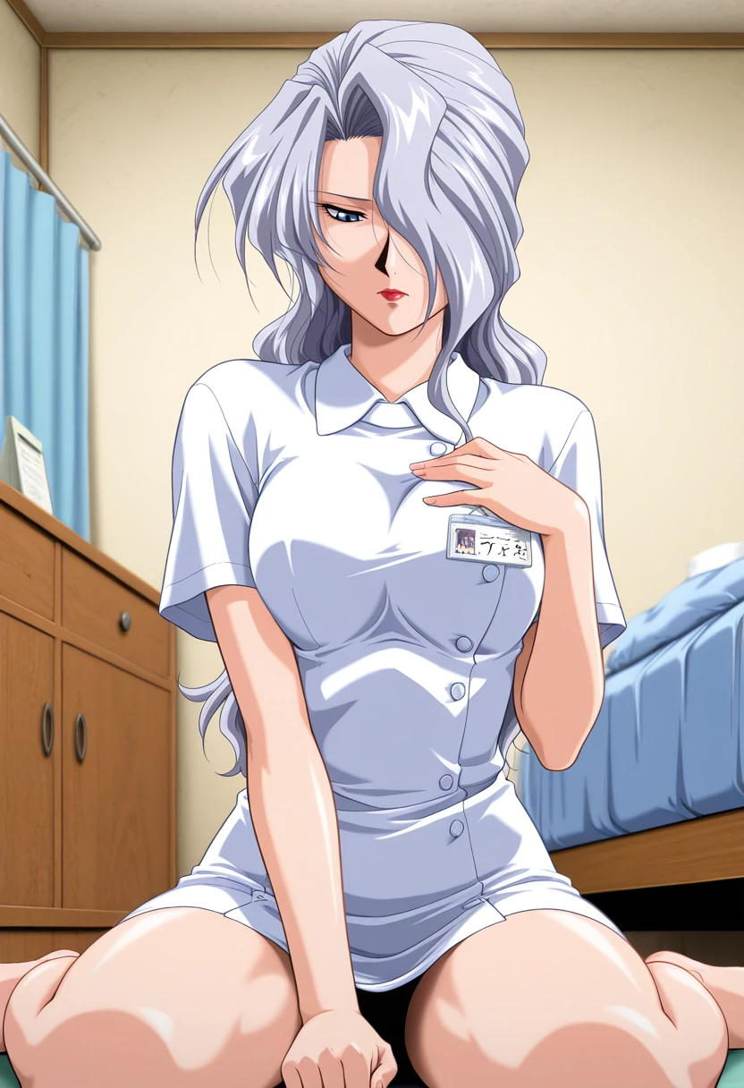 emikoww, mature female, blue eyes, grey hair, long hair, hair over one eye, red lips, medium breasts,