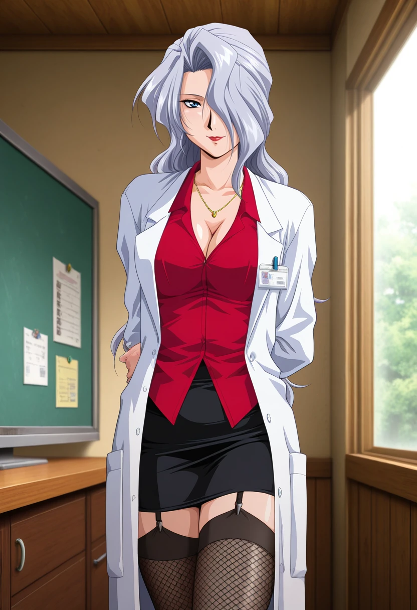 necklace, cleavage, lab coat, red dress shirt, untucked shirt, black pencil skirt, garter straps, black fishnet thighhighs, high heels,