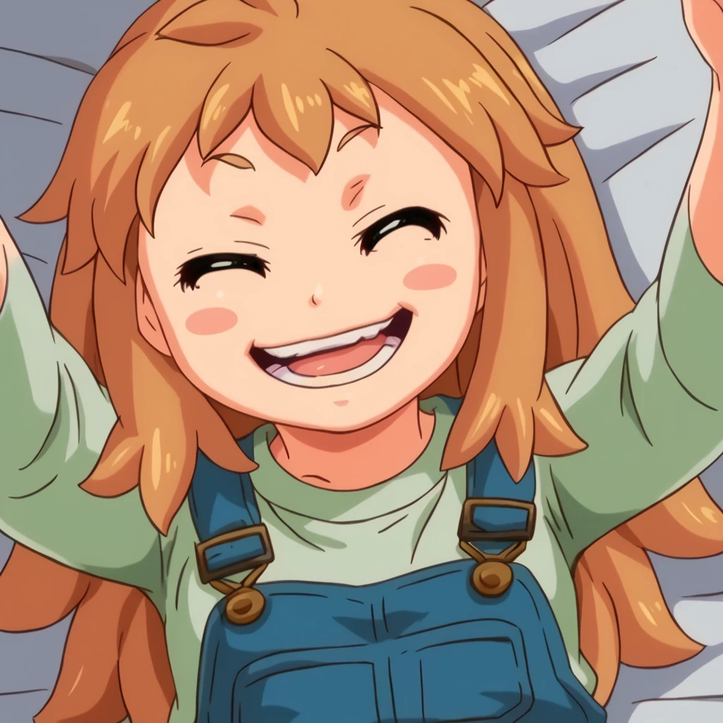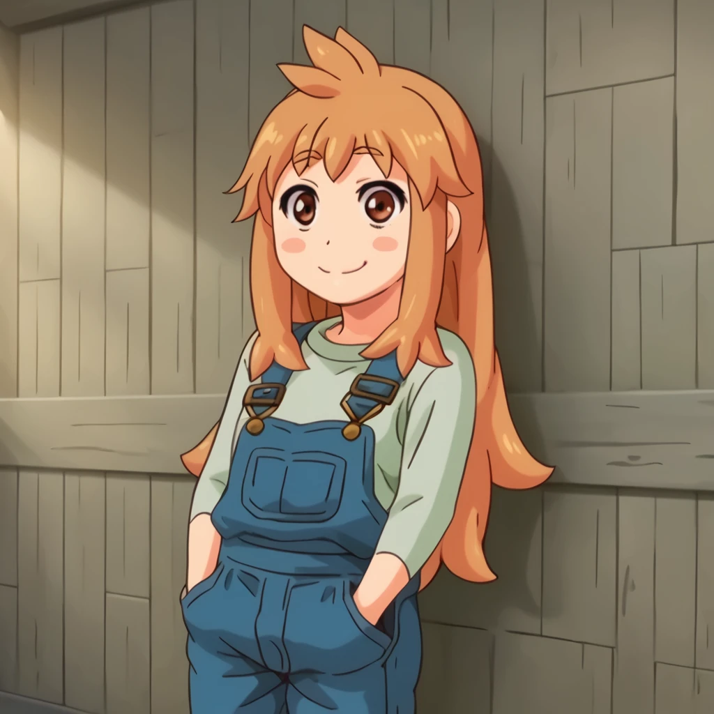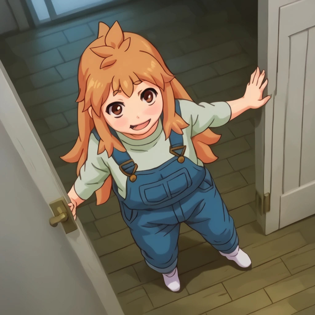 ninjin, 1girl, orange hair, blush stickers, blue overalls, green shirt,
