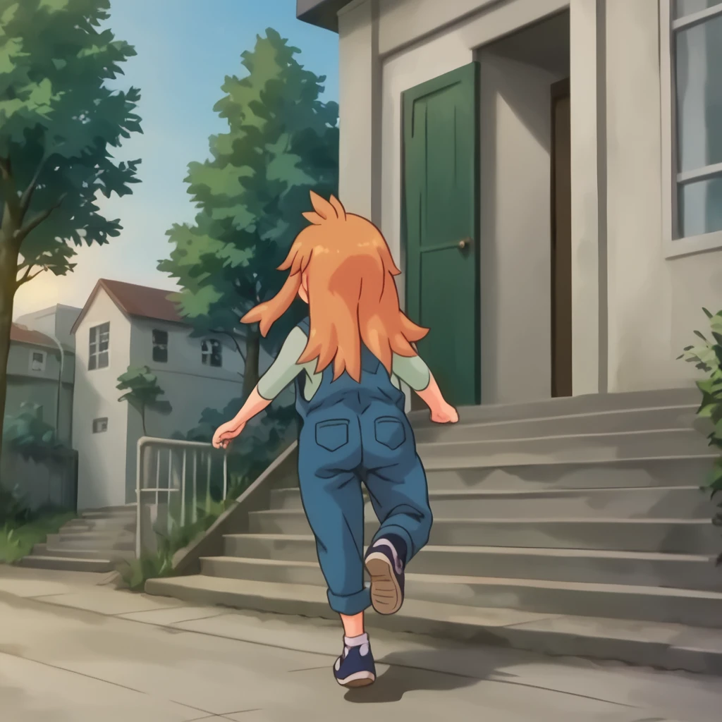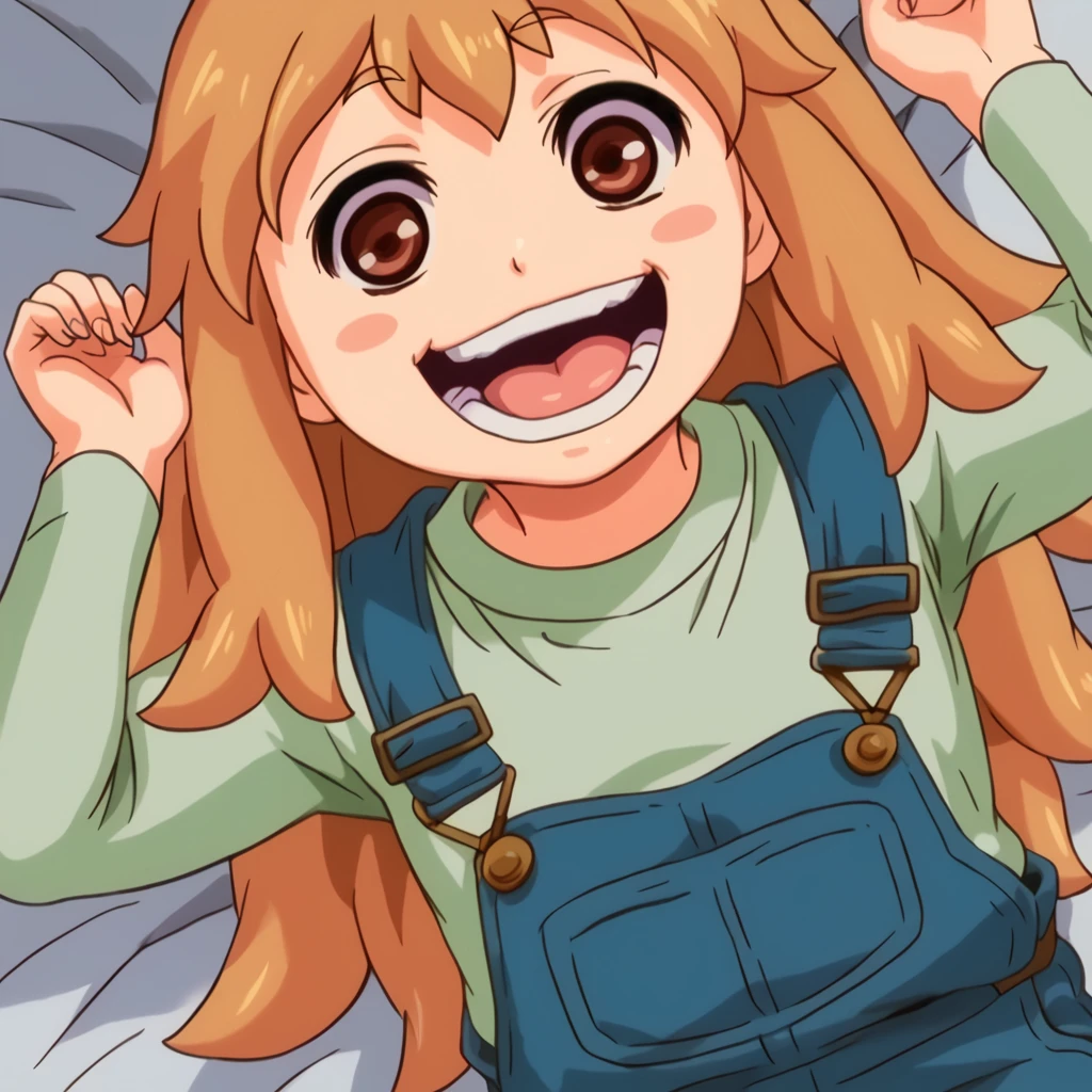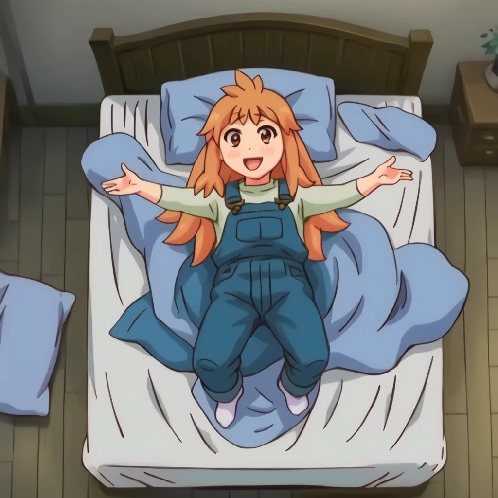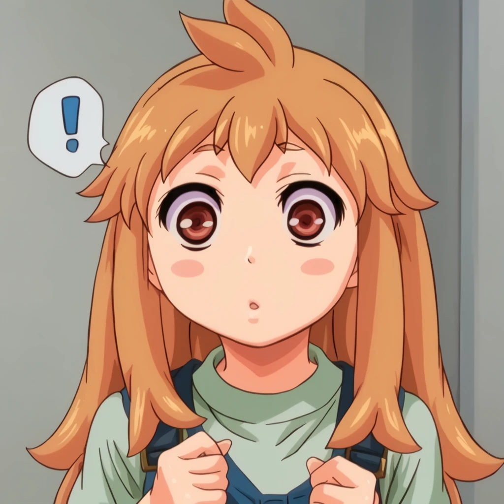 ninjin, 1girl, orange hair, blush stickers, blue overalls, green shirt,