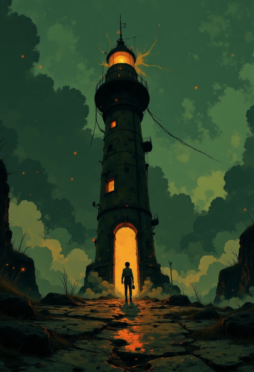 "A fantasy lighthouse in a desolate wasteland, glowing with eerie orange light from its windows, under a stormy green sky, with two figures walking toward it. Surreal post-apocalyptic environment, cinematic perspective."
