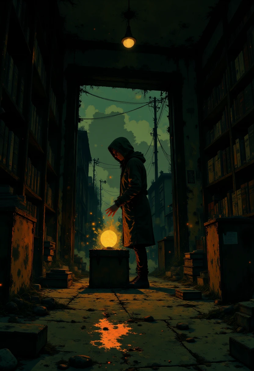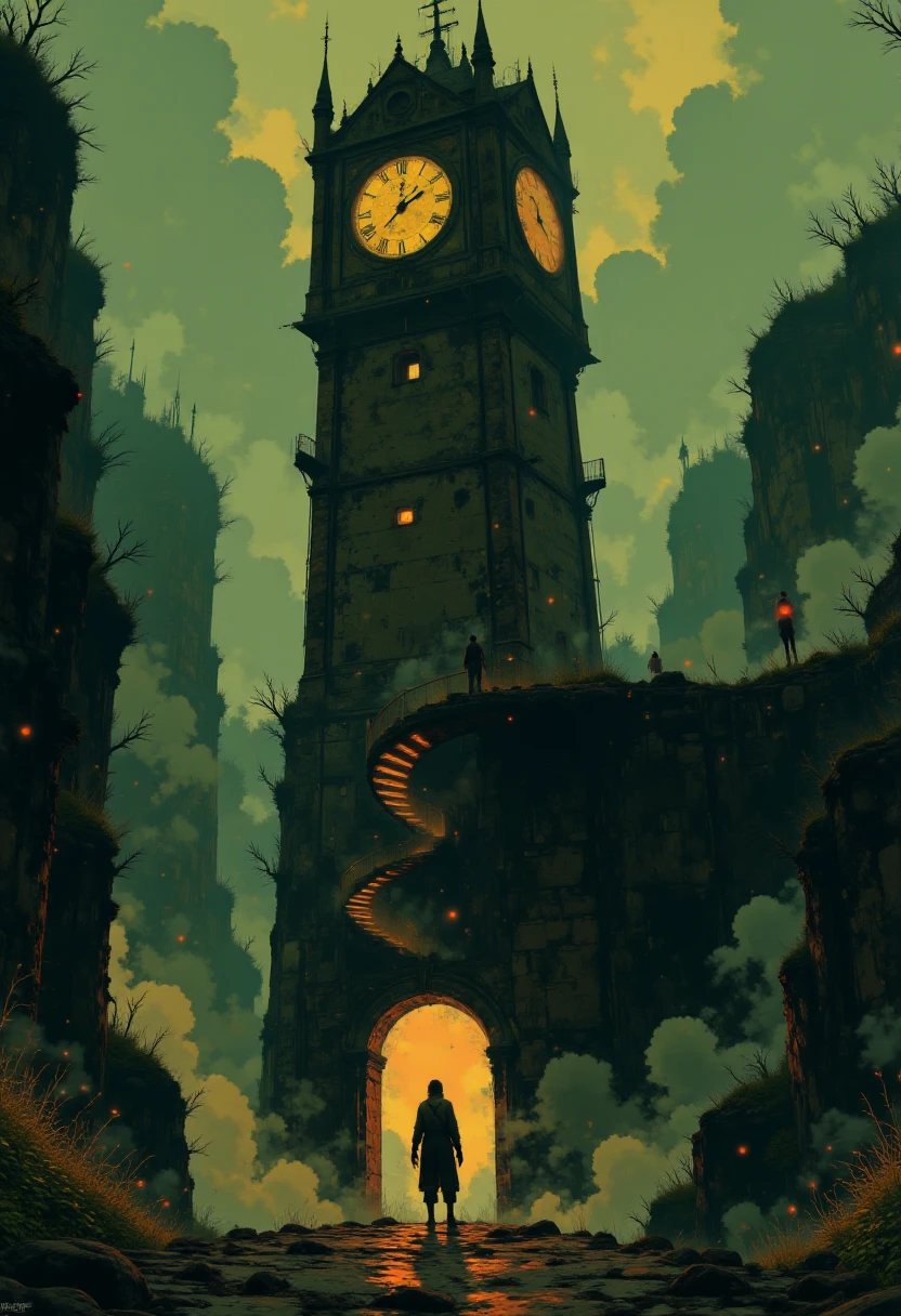 "A glowing clocktower in a crumbling post-apocalyptic city, surrounded by overgrown vegetation, with a silhouetted figure standing on a broken staircase. Cinematic lighting, mystical atmosphere, rich earthy tones, dramatic composition."