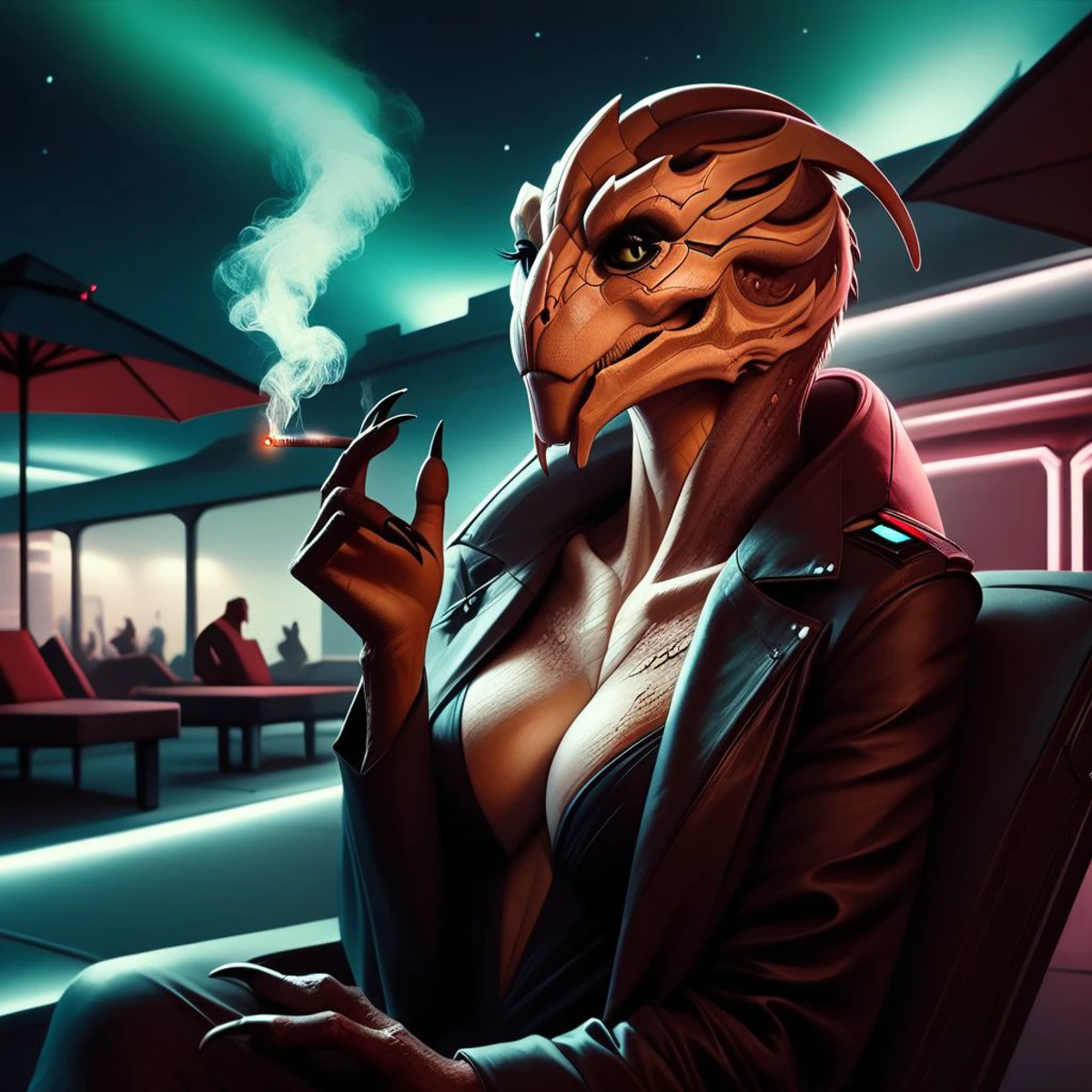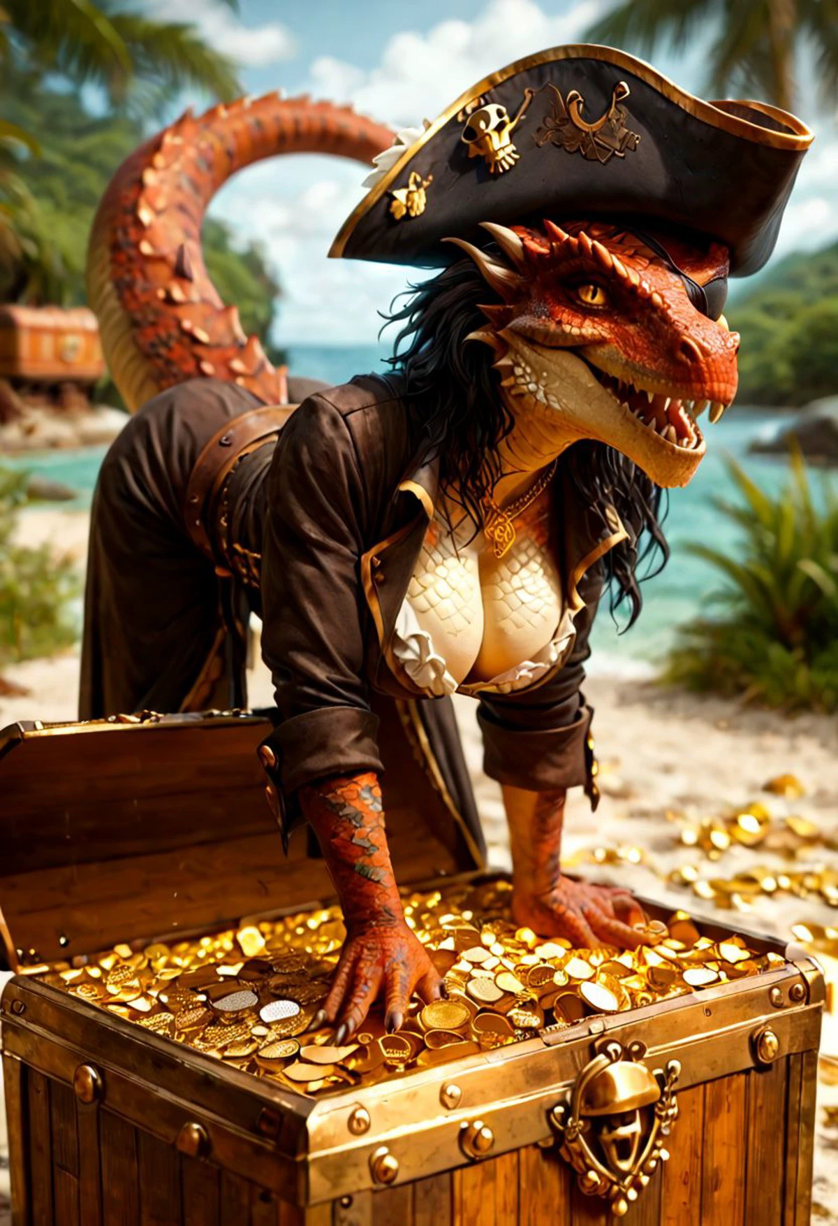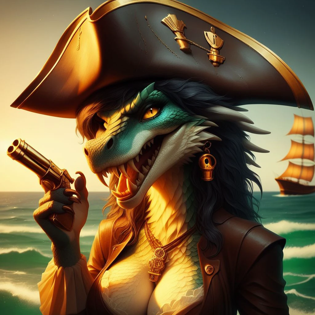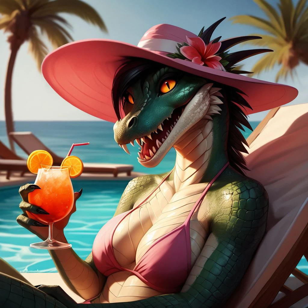 Example 1: Dragon-crocodile-wolf woman sun bathing with pink hat/bikini and tropical drink