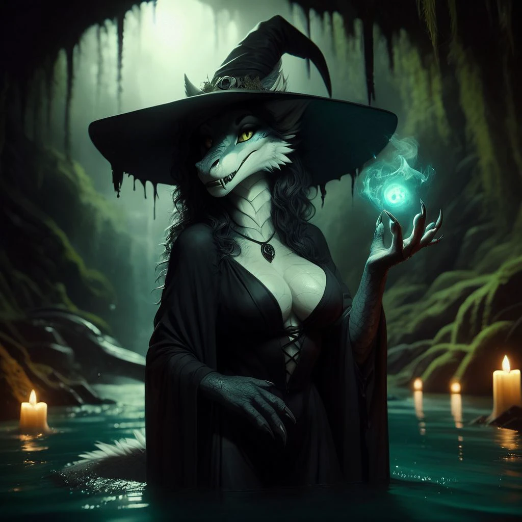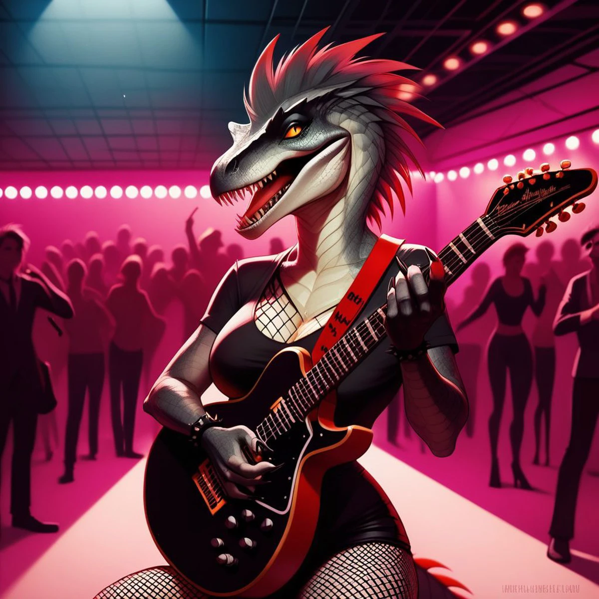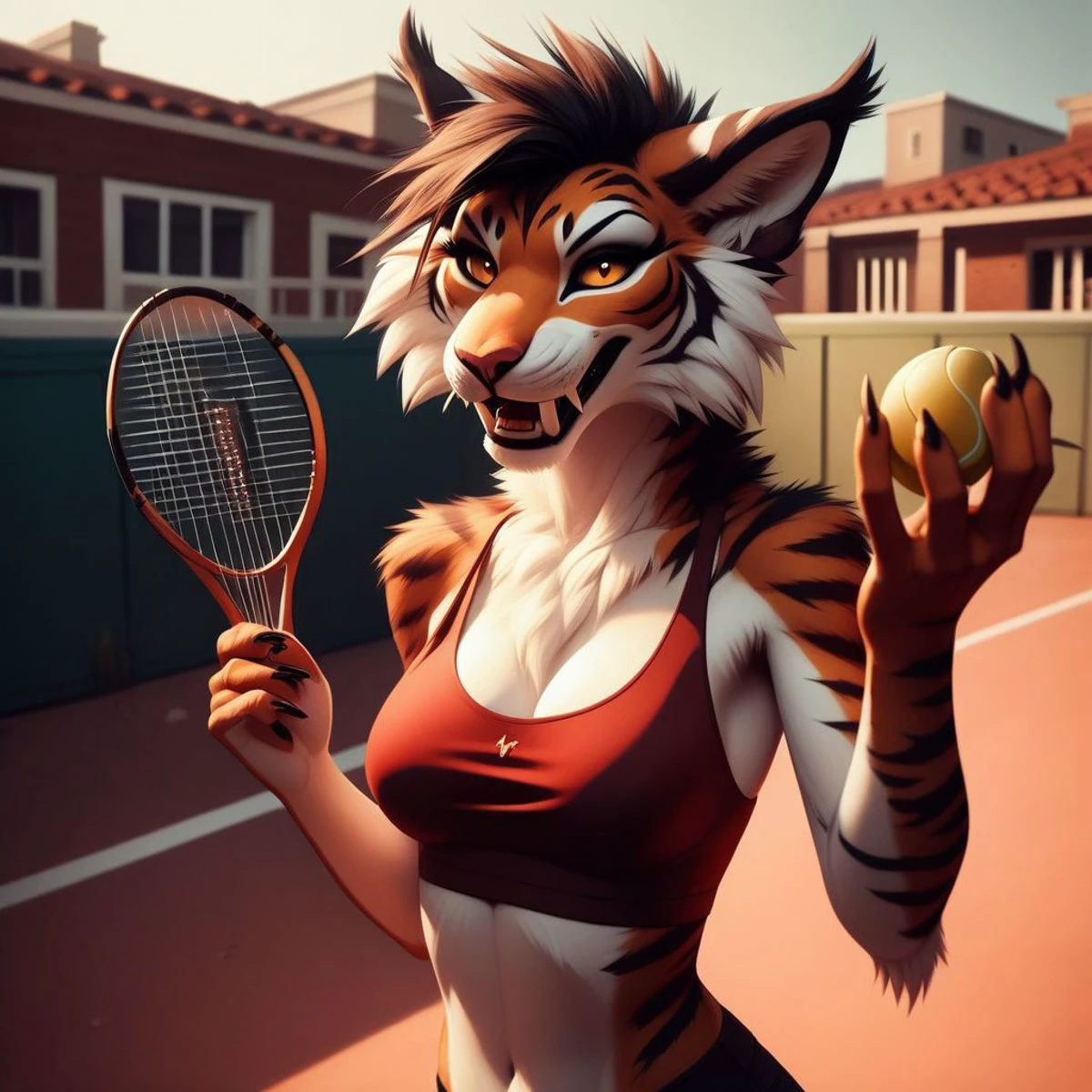 Example 1: Dragon-crocodile-wolf woman sun bathing with pink hat/bikini and tropical drink