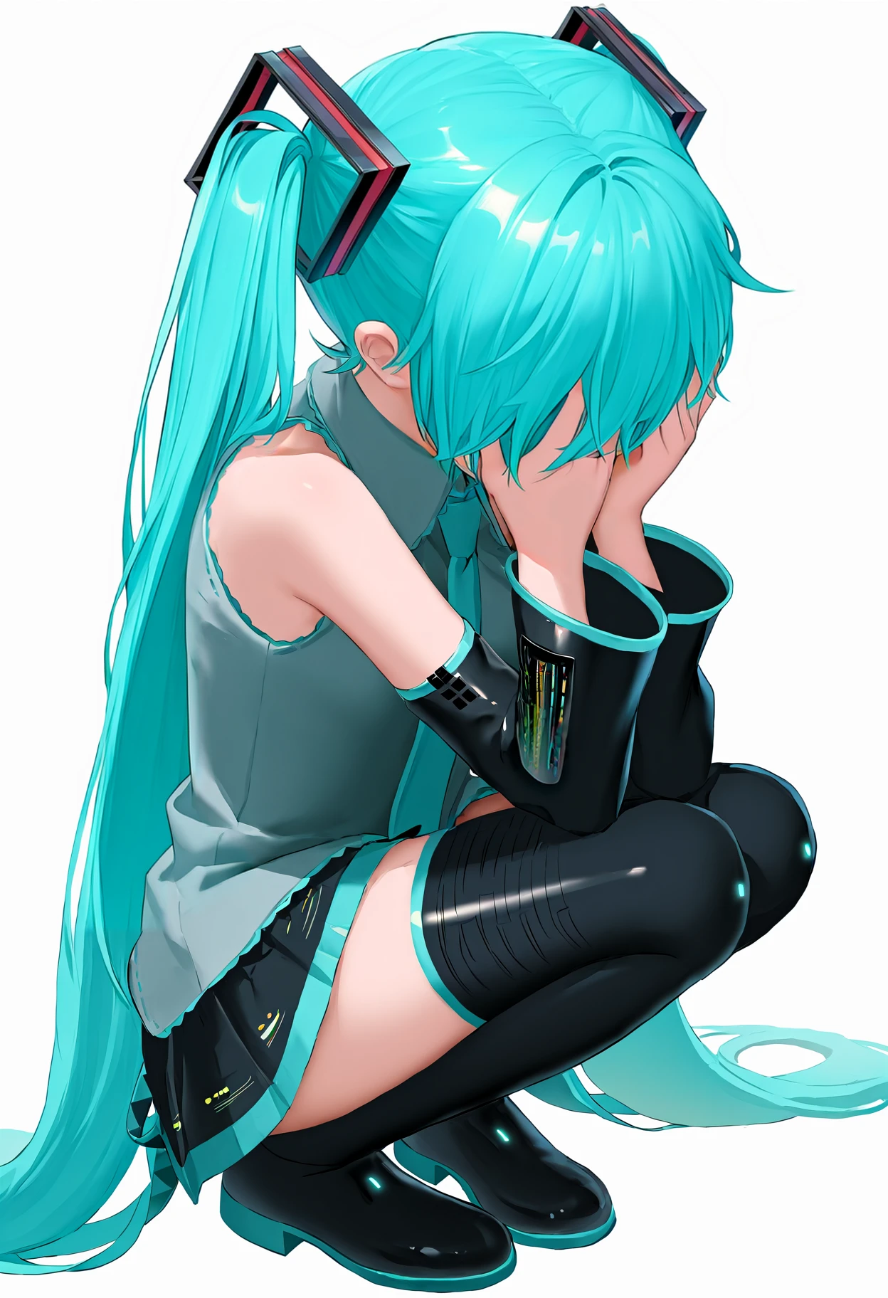 Recommend adding some of these tags: facing down, hands on own face, hugging own legs