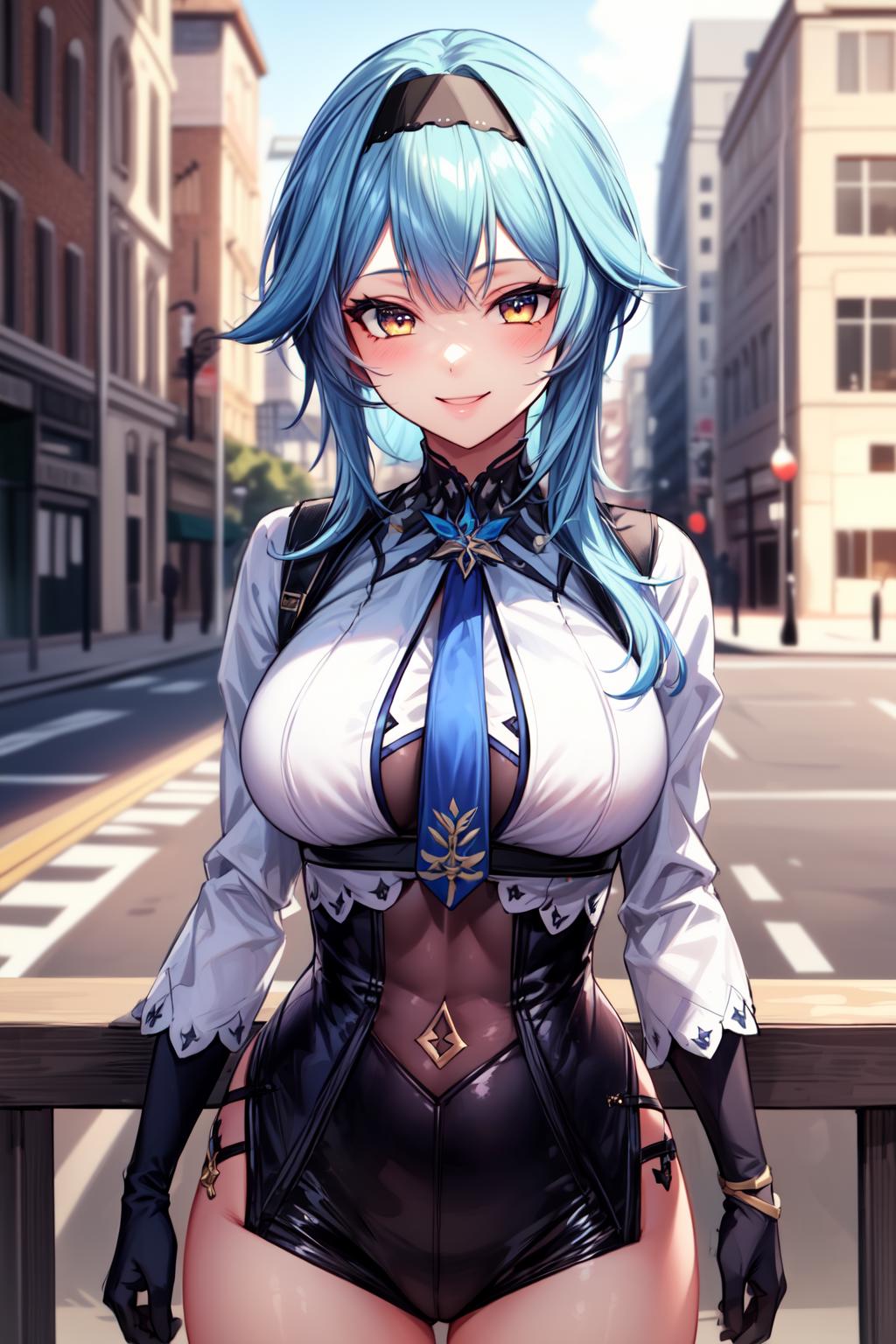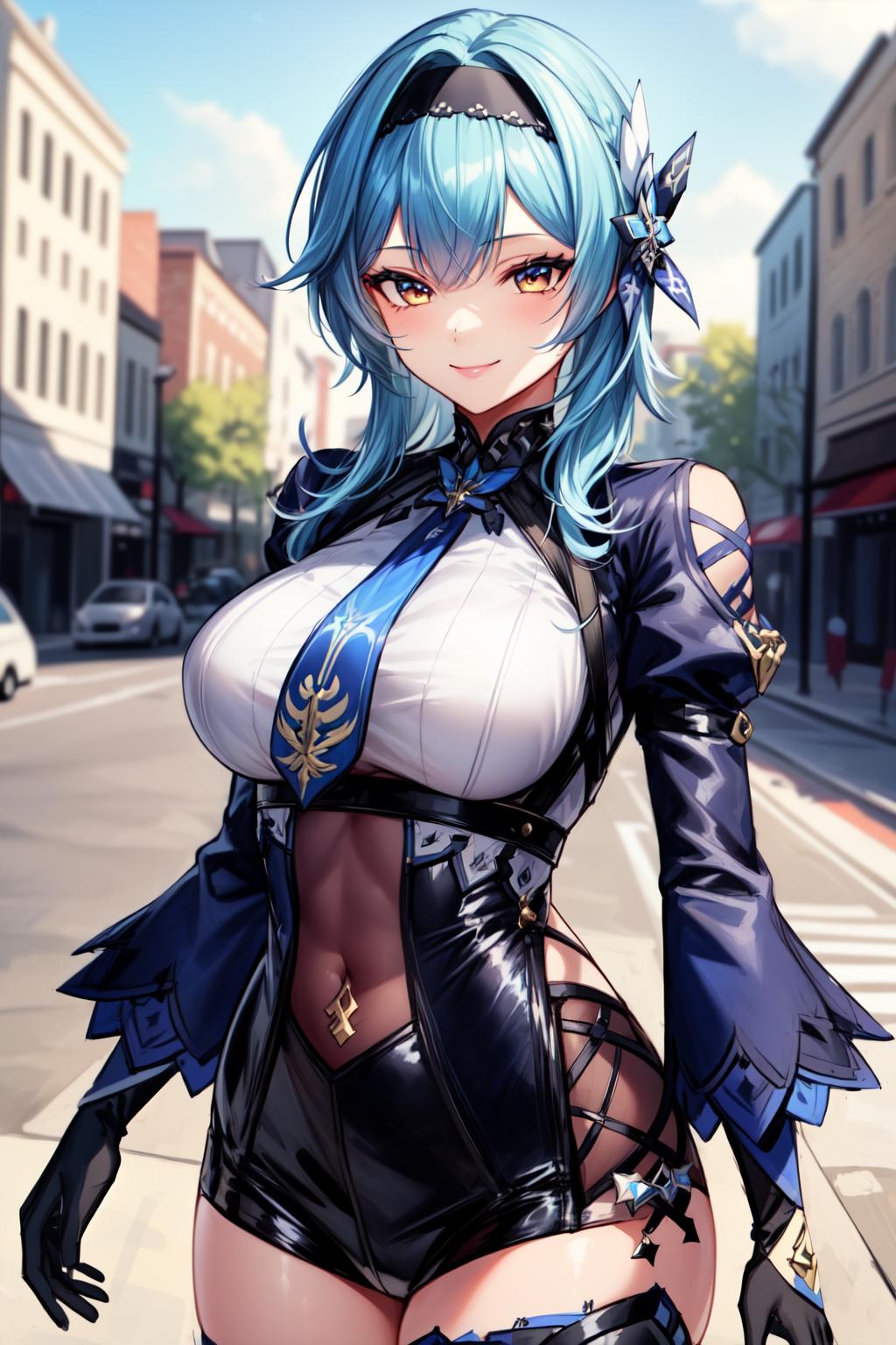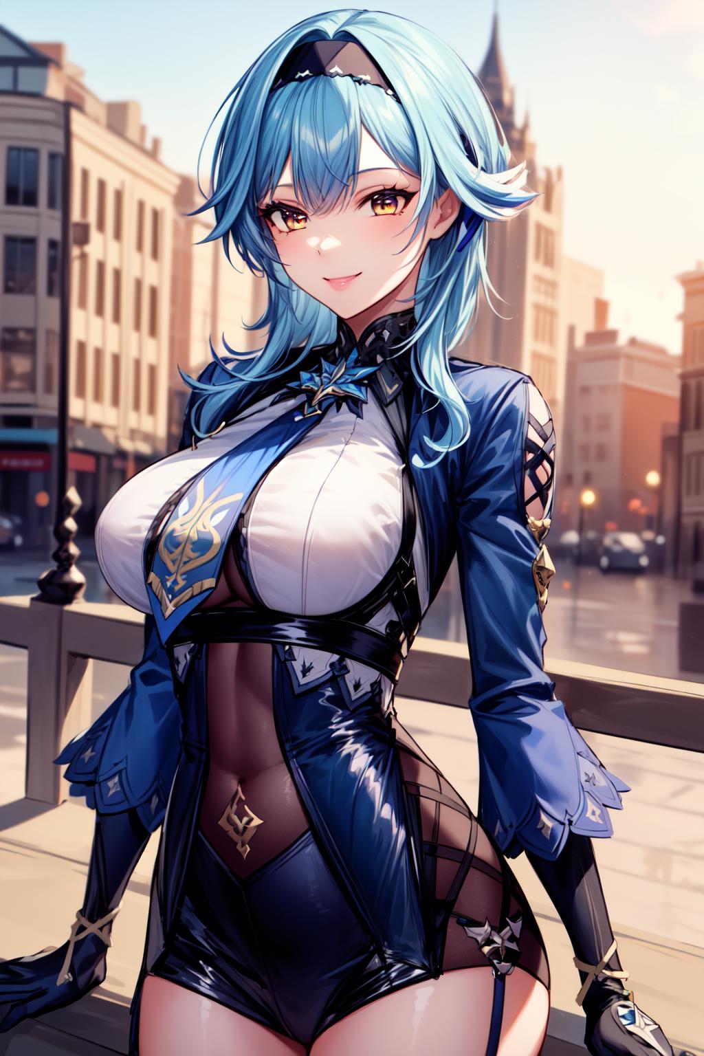 EulaGenshin_NDV, 1girl, blue hair, large breasts, medium hair, leotard, long sleeves, black hairband, blue necktie, blue gloves, purple-yellow eyesBest weight: 0.6-0.8