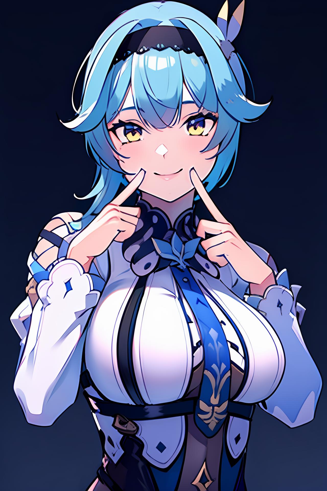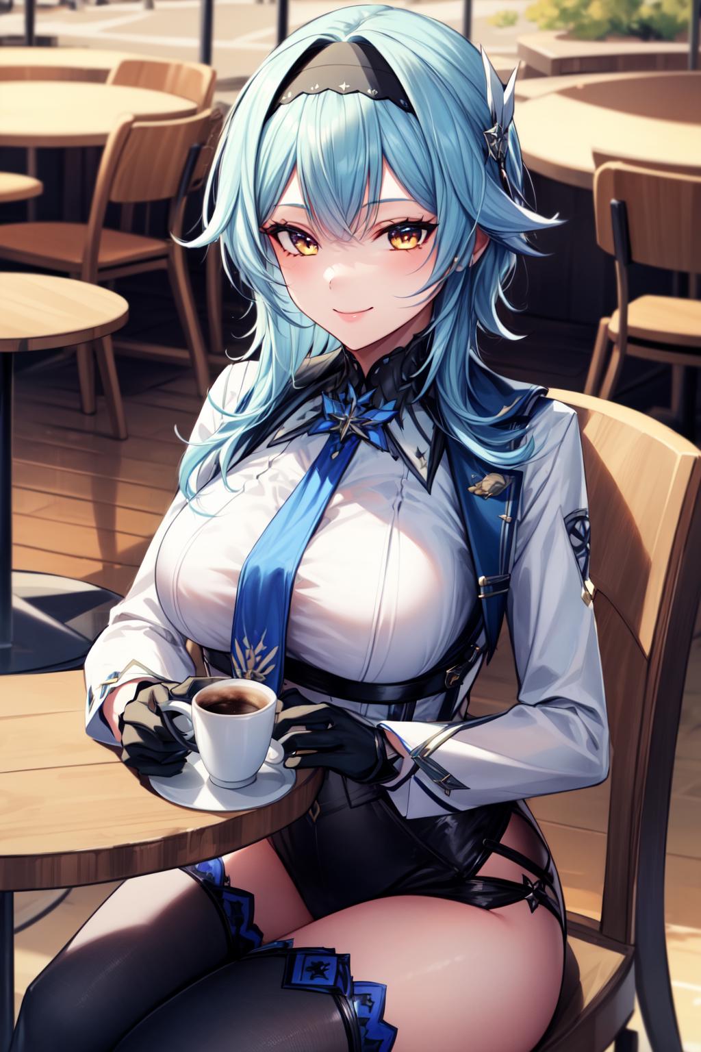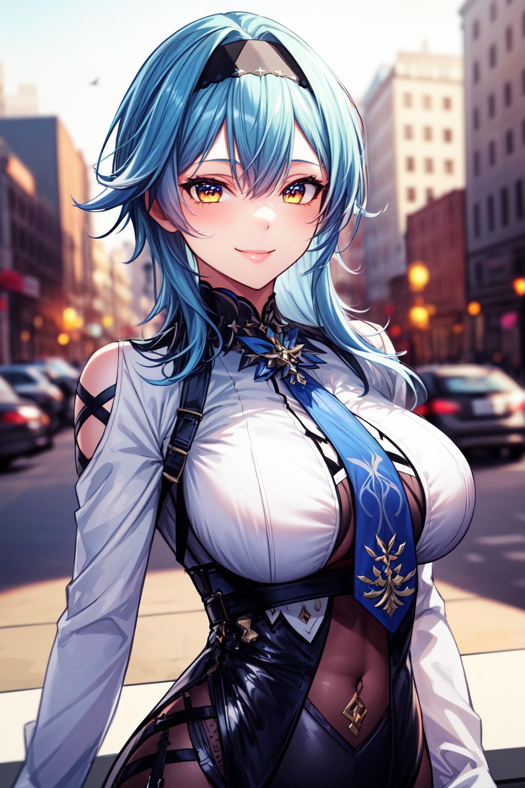 EulaGenshin_NDV, 1girl, blue hair, large breasts, medium hair, leotard, long sleeves, black hairband, blue necktie, blue gloves, purple-yellow eyesBest weight: 0.6-0.8
