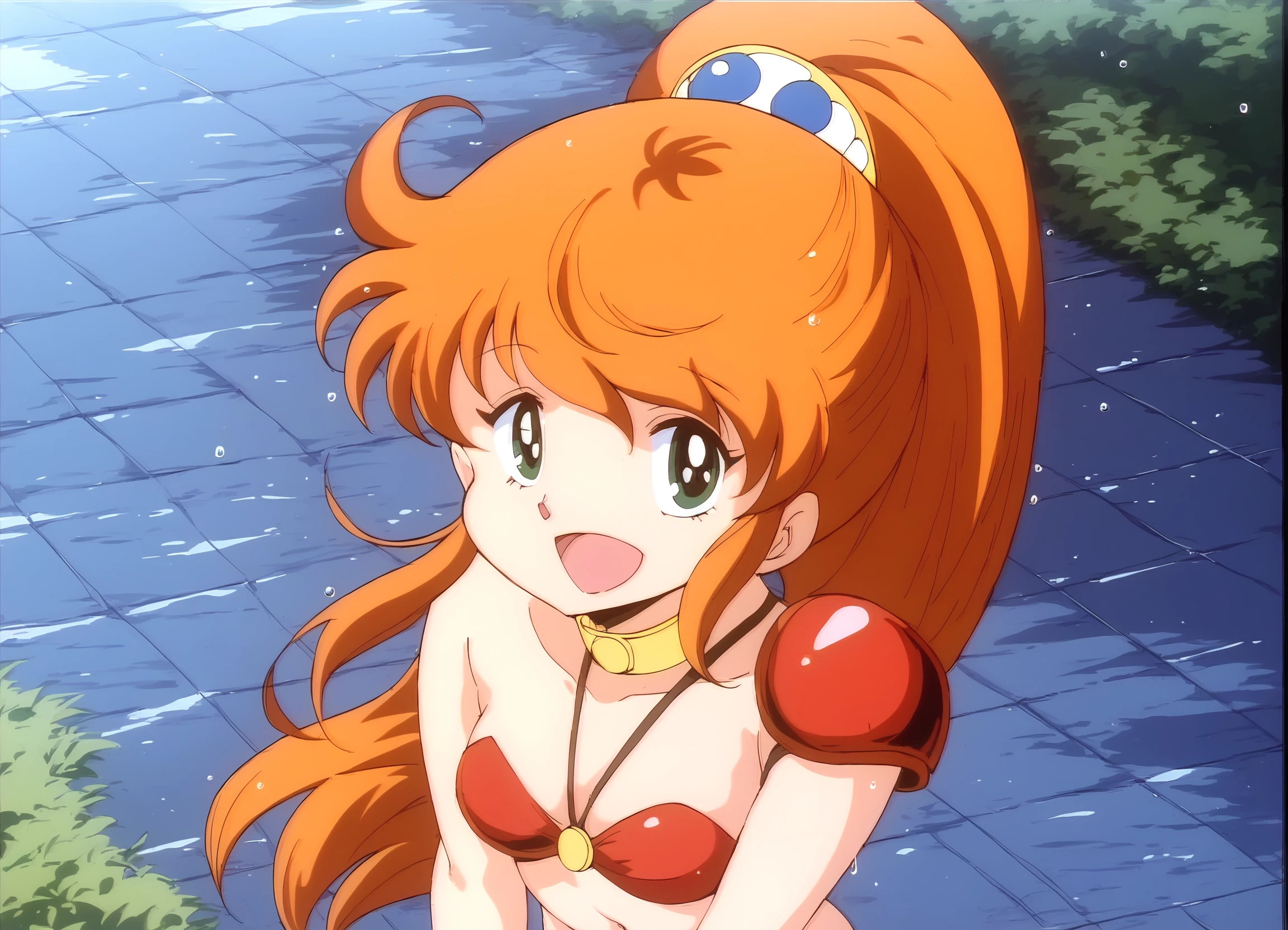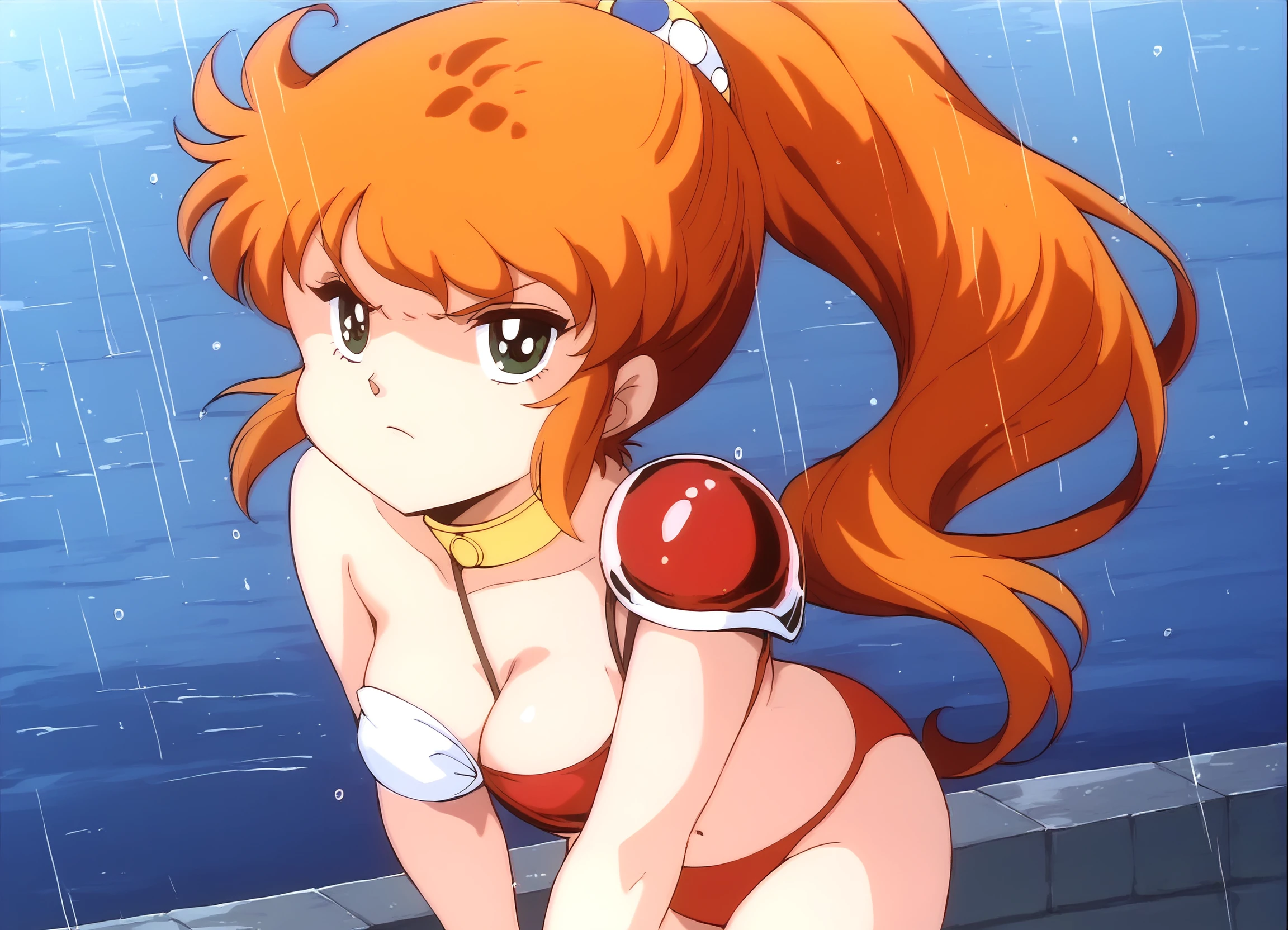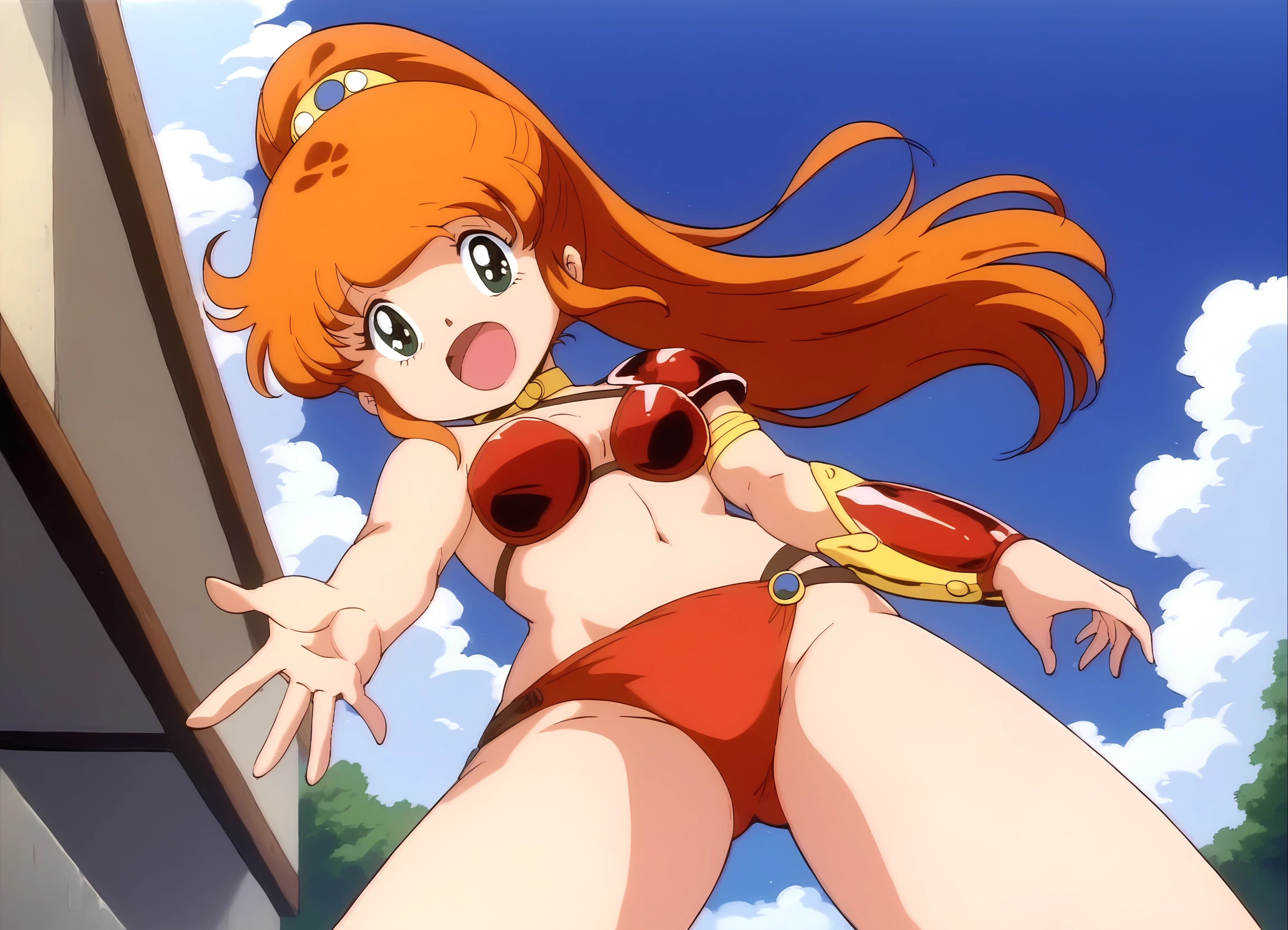 <lora:Cream Lemon (Super Dimensional Legend Rall) Caron Pony v1_epoch_10:0.8>, 1girl, caron_rall1, green eyes, orange hair, high ponytail, long hair, hair ornament, sidelocks, (medium breasts:1.3), midriff, navel, thighs, (red buruma:1.1), bikini armor, armor, armlet, choker, collar, gauntlet, leg armor, shoulder armor